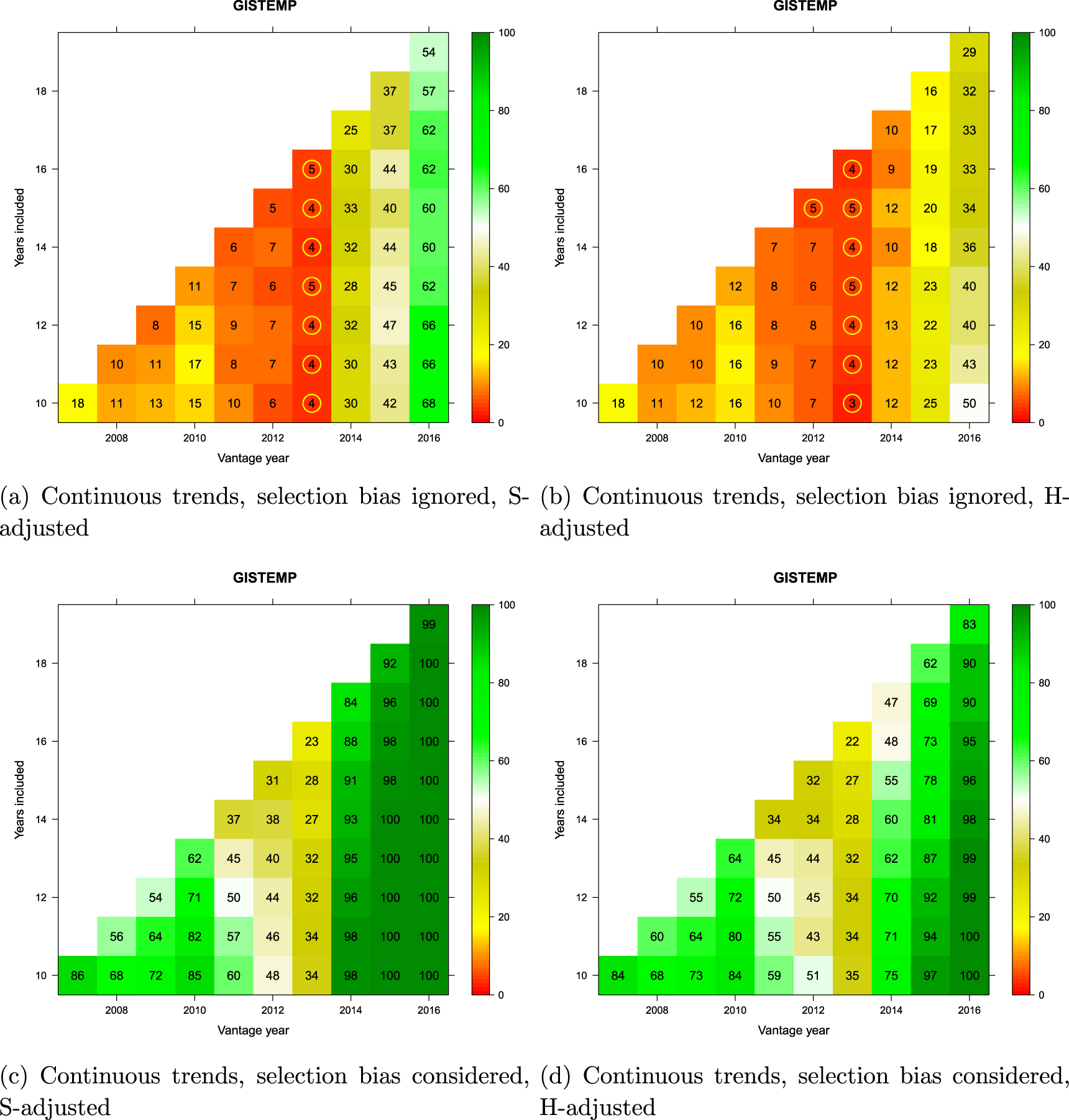 When the selection-bias problem was accounted for (bottom panels in the figures), the observed candidate 'pause' was compared against each possible trend of the same duration at all possible times in each synthetic realization since the onset of modern global warming. (The onset year was determined separately for each dataset based on the analysis reported by Cahill et al 2015.) The cell entries record the percentage of synthetic realizations in which at least one such trend fell below the observed candidate 'pause' trend. This percentage can be interpreted as 'how unusual is the observed trend in light of what would be expected to arise due to internal variability alone at some point in time during global warming'.