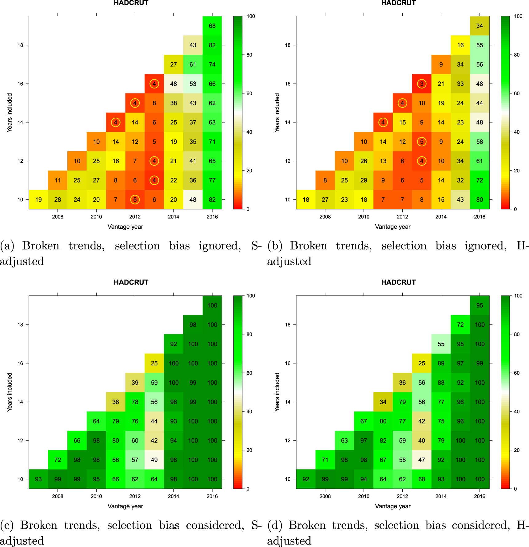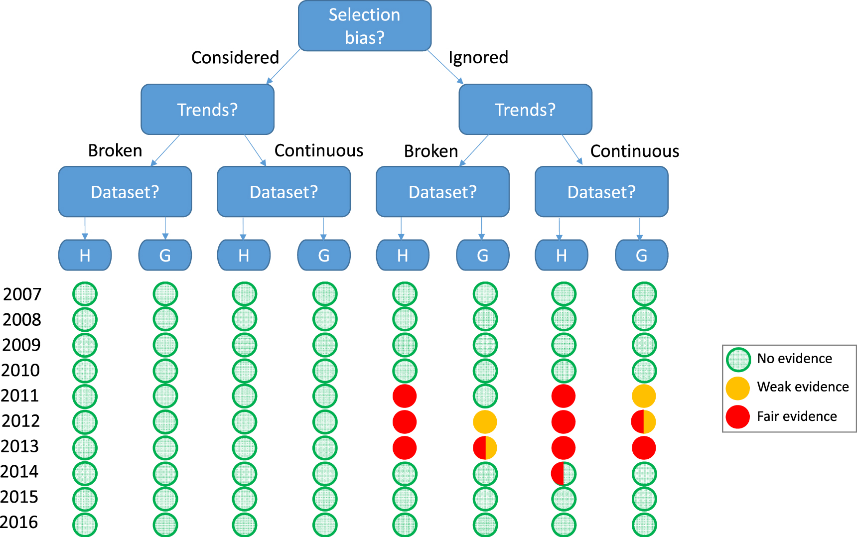 Figure 13 summarizes the Monte Carlo analysis in a decision tree that outlines the major options for analysis. The tree captures the fact that researchers must make several choices about the analysis. They must decide whether or not to correct for the selection-bias issue (the top decision node in the figure). They must decide how to model the pause-interval (as broken or continuous trends; second level of decision nodes). They must choose which dataset to use (HadCRUT or GISTEMP; third level). The tree pinpoints the conditions under which—and when—apparent evidence for a divergence existed. The state of the evidence is represented by the leaves of the tree (small circles) at the bottom of the figure. Green leaves denote absence of evidence, defined as more than half of all possible trend durations in that vantage year exceeding the bottom 10% of synthetic realizations. Any leaf that is partially or wholly orange or red signals the appearance of some degree of evidence for a divergence between observations and model projections. The evidence is considered poor (orange leaves) if half or more of all possible trend durations in that vantage year fall below the bottom 10% of synthetic realizations. The evidence is considered fair (red leaves) if, in addition, there is at least one trend in that vantage year falls below the bottom 5% of synthetic realizations. It is clear that any such evidence was limited to the time period 2011–2013 and only emerged when the selection-bias problem was ignored.