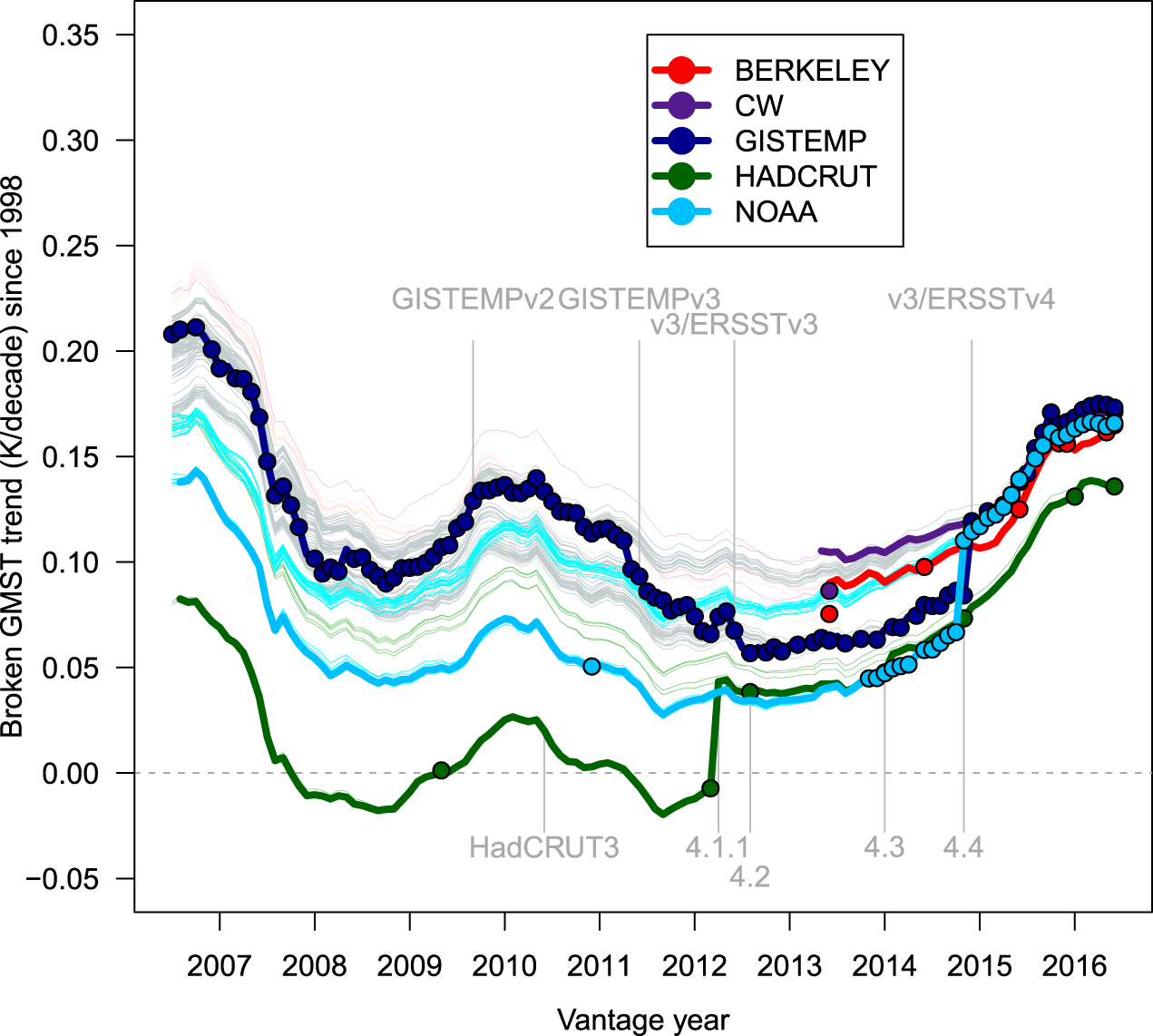 Figure 1. Historically conditioned trends for major GMST datasets; Berkeley (Cowtan and Way 2014); the U.K. Met Office's HadCRUT (Brohan et al 2006, Morice et al 2012); NASA's GISTEMP (Hansen et al 2010); Cowtan and Way's improved version of HadCRUT (Cowtan and Way 2014); and NOAA's dataset (Vose et al 2012). Each solid line plots the best-fitting least squares trend from the start year of 1998 to the end year (vantage year) as shown on the x-axis. The thick lines for each dataset correspond to the version available and current at a given vantage year, with the vertical gray lines indicating major changes in version. The thin lines provide retrospective trends that show what the trends would have been if later versions of the data (represented by solid points) had been available earlier. The solid points indicate the dates of versions of each dataset that were available for analysis. The trends are incremented from monthly data which results in some fine scale variation.