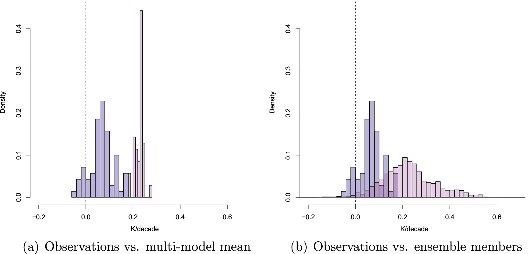 Figure 2. Normalized density distribution of observed decadal temperature trends (blue) and the corresponding trends in the CMIP5 simulations (pink). For the observations, the dataset and time periods were as in the corpus of published articles (N = 50) on the apparent divergence between models and observations. An article contributes multiple observations if multiple datasets were used. The same time periods were used to construct the modeled distribution of trends from globally averaged surface air temperatures (TAS). Model runs are as in table 3 and used the original forcings from the CMIP5 experiments. Historical runs are spliced together with RCP8.5. Panel (a) shows the trends for the multi-model mean only, and panel (b) shows the trends for all CMIP5 ensemble members.