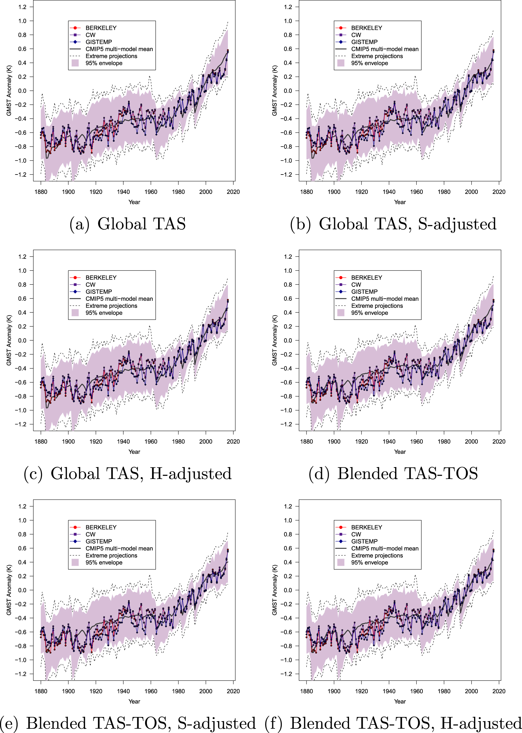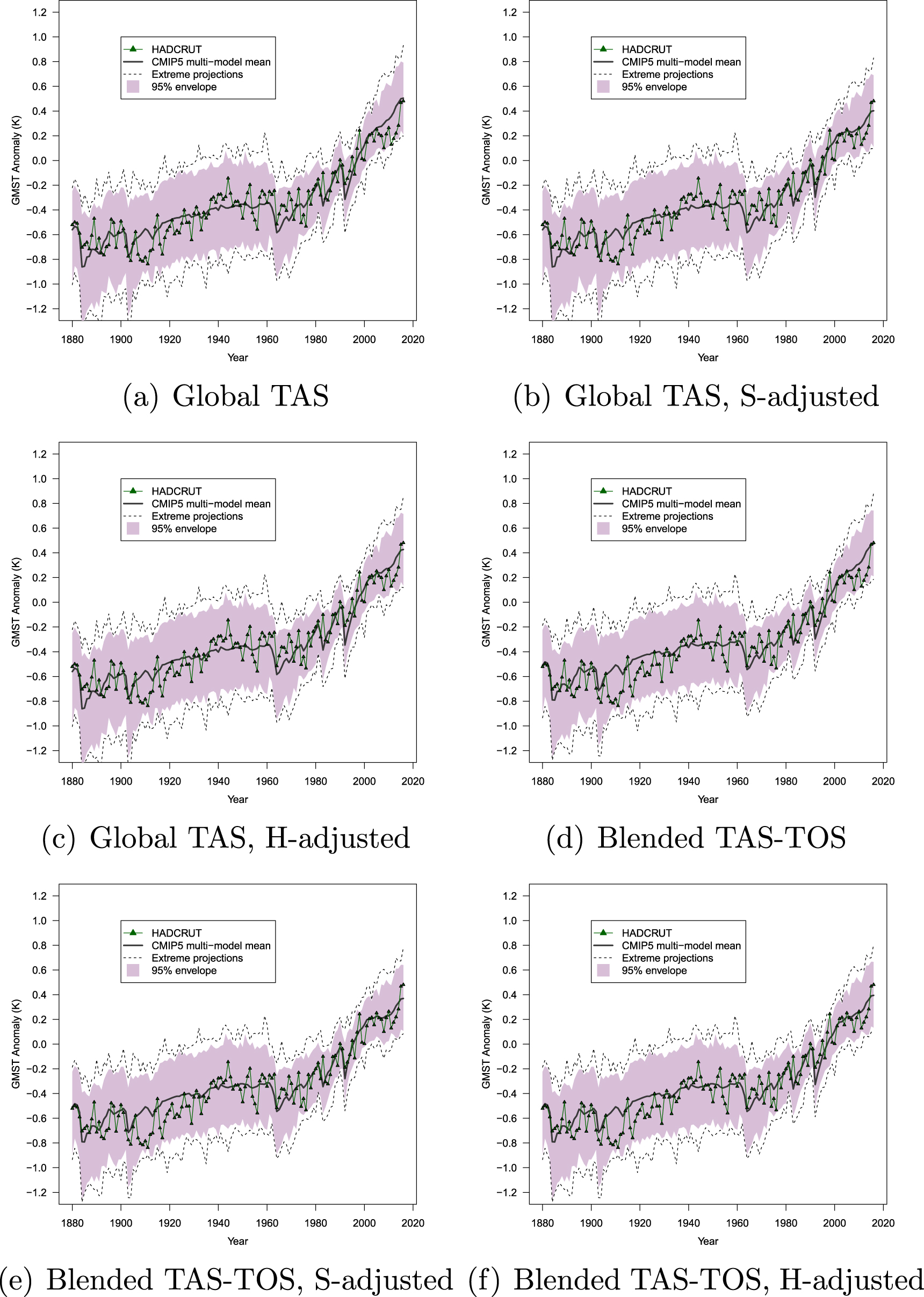 We provide the same historical conditioning for the CMIP5 model projections based on the two major revisions just discussed. Because the revisions to the forcings involve two alternative adjustments (S-adjusted versus H-adjusted), we use both in our historically-conditioned analysis. In addition, when models are compared to the HadCRUT datasets, historical conditioning entails a change in the coverage mask between HadCRUT3 and HadCRUT4 to mirror the change in coverage between the two datasets.