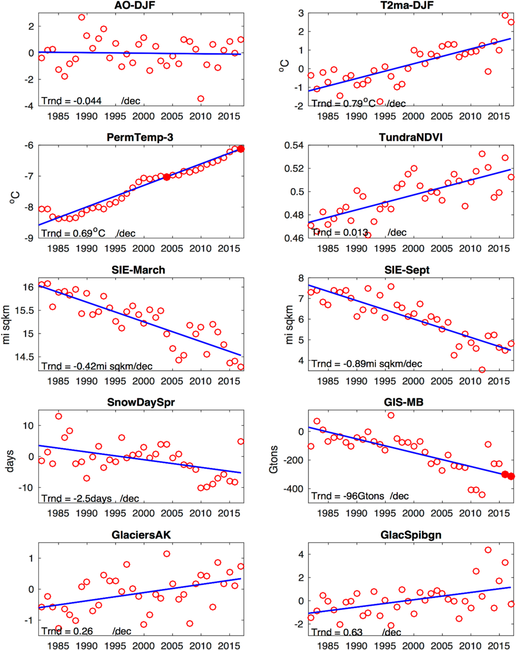 Northern Alaskan permafrost temperatures, winter sea ice extent, and tundra greenness (satellite maximum NDVI) follow winter surface air temperatures over the period of record since 1982. Summer sea ice extent, spring snow days, and Greenland ice sheet mass balance impact have increasing trends after 2005. Atmospheric circulation does not play an important role in long term Arctic change as do temperature related increases. This separation of atmospheric circulation forcing from temperature forcing of Arctic change was also noted by Screen et al (2018) and references there in.