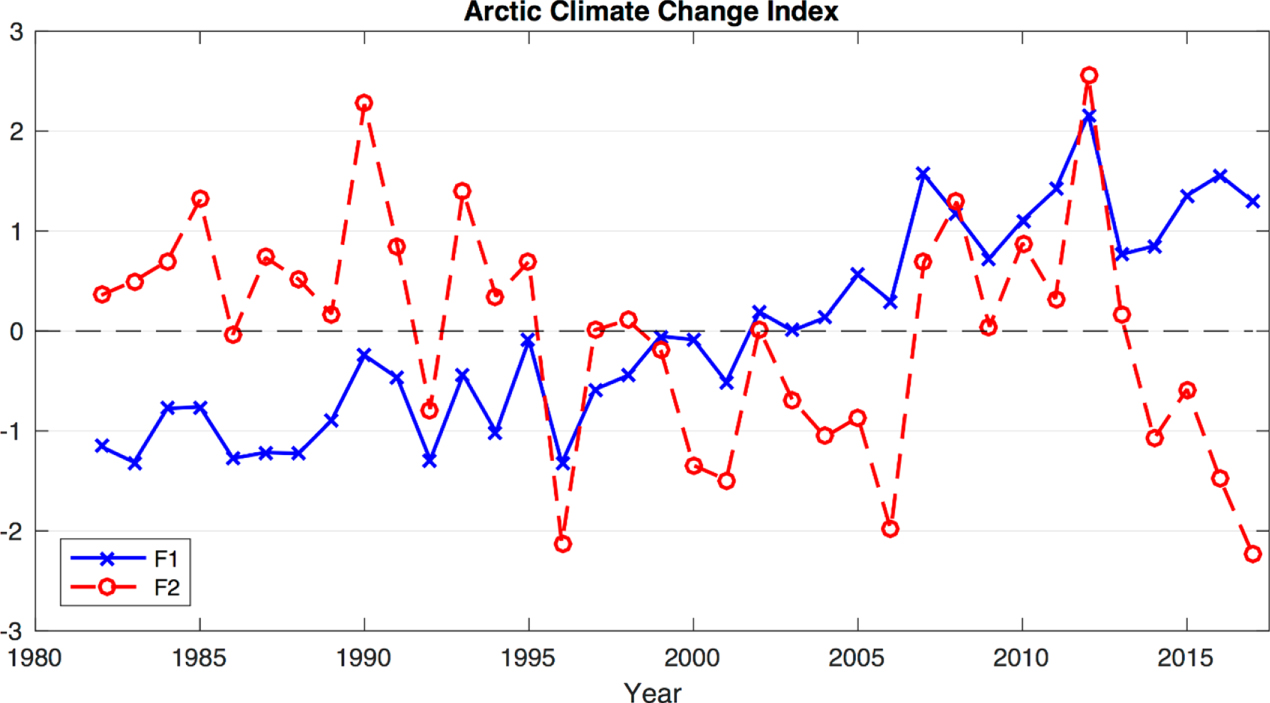 Table 2. Factor loadings using 2-factors based on 7 time series from 1982–2017. Time series is normalized by their standard deviations, but the linear trend is kept.