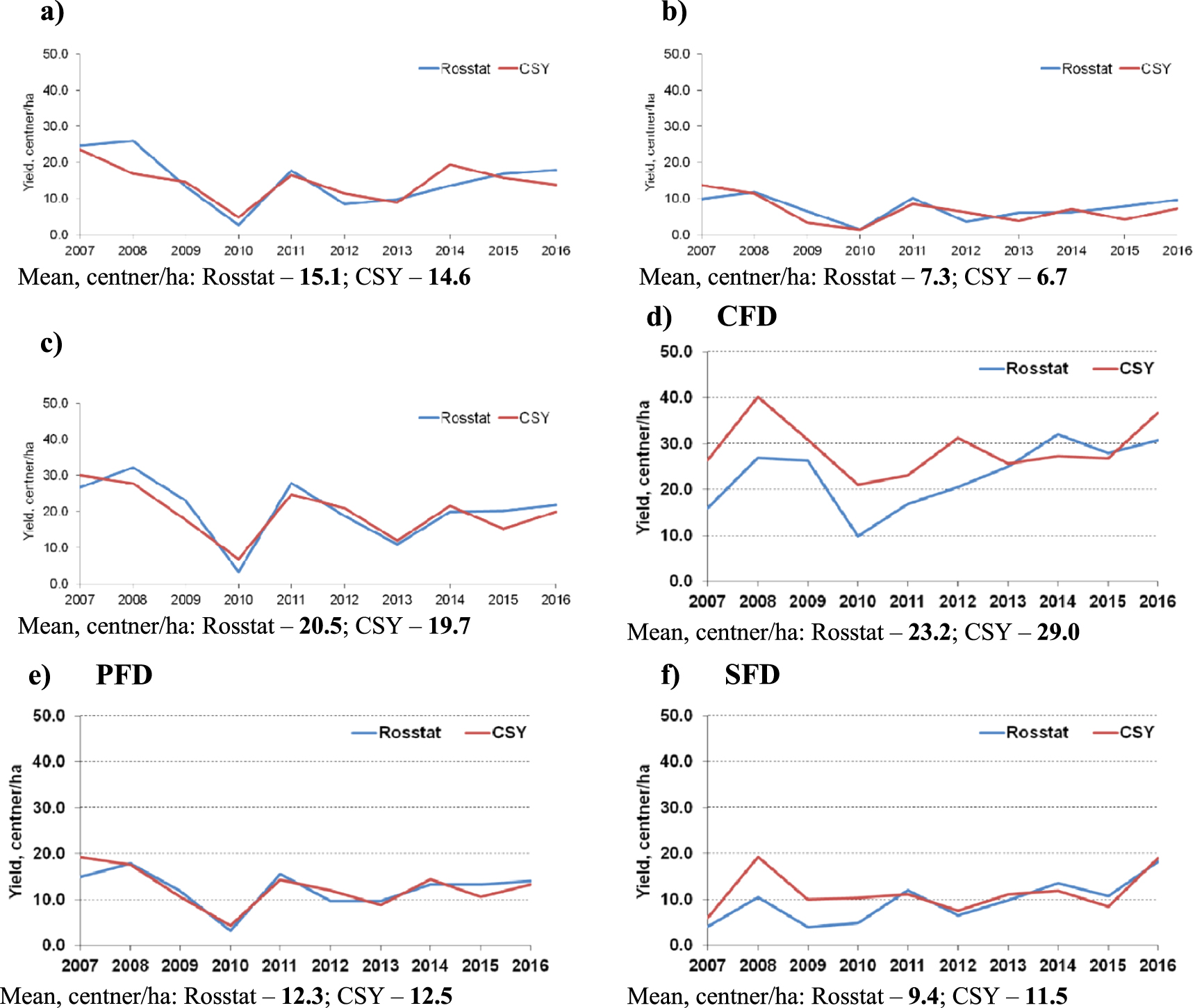 Input information in CSY is temperature- and precipitation-simulated here by the MGO RCM ensemble (CSY setup is the same for all the simulations). Validation of CSY is based on retrospective modeling when the model is driven by meteorological and agrometeorological observations spanning 2007–2016. The simulation is compared with the observed dynamics of yields for the same period in large sowing areas occupied by grain crops in Orenburg region, Tatarstan and Bashkortostan, and three federal districts CFD, PFD, and SFD.