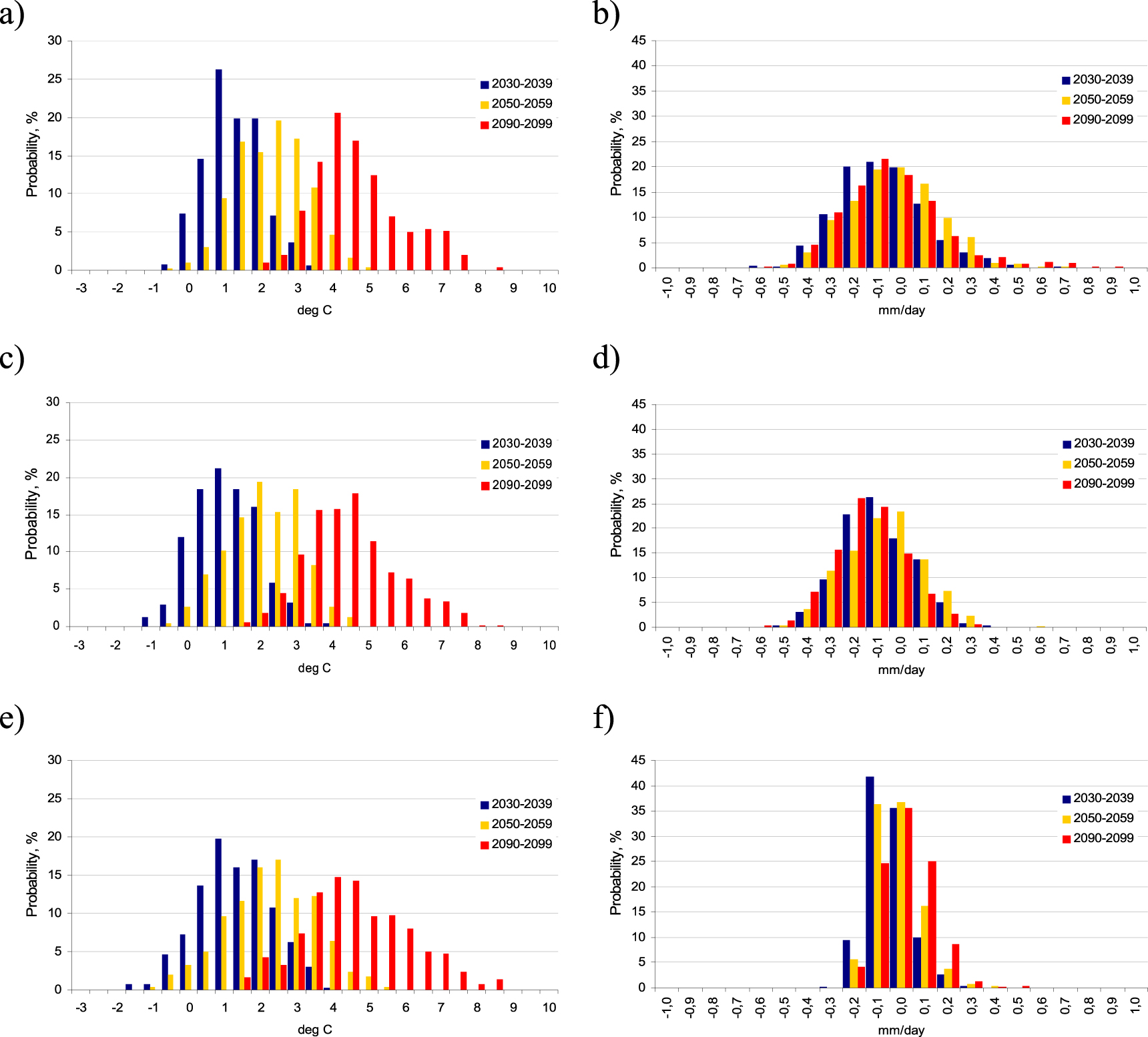 Figure 5. Probabilistic distribution functions of the projected changes in the surface air temperature (a), (c), (e) and precipitation (b), (d), (f) during warm period (May–September) in the CFD (a), (b), PFD (c), (d), and SFD (e), (f) as simulated by fifty-member ensemble of the RCM for 2030–2039, 2050–2059, and 2090–2099 relative to 1990–1999 under RCP8.5 scenario. Units are °C and mm d−1, respectively.