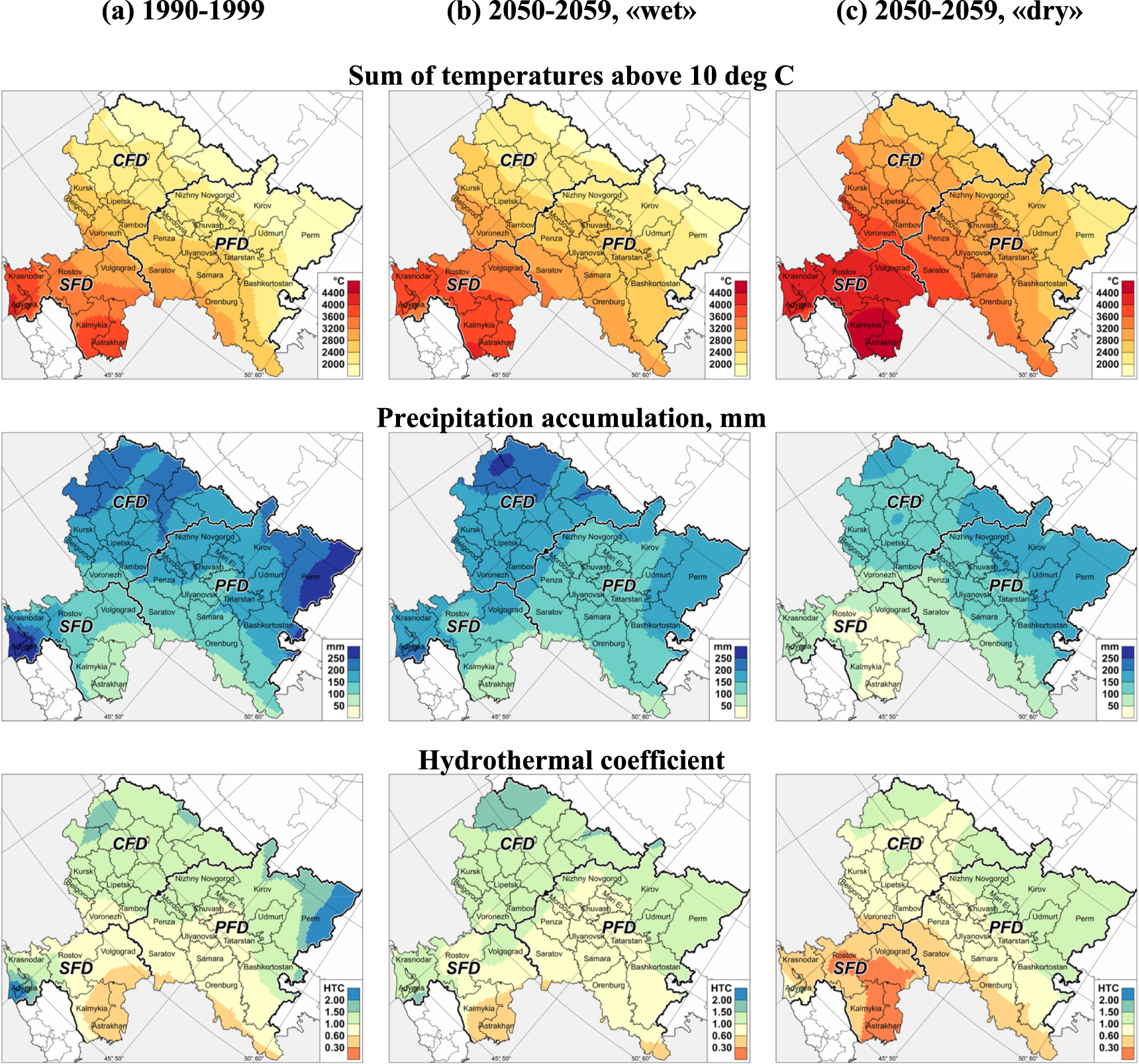 | Federal district | Projection | Mean T, °C January | Mean T, °C July | Sum of T > 10 °C | Germination date, day | Vegetation period, day | Mean T of the vegetation period, °C | Mean P of vegetation period, % | Hydrothermal coefficient | Soil moisture in upper 1 m layer in June, mm | Evaporation deficit, mm |