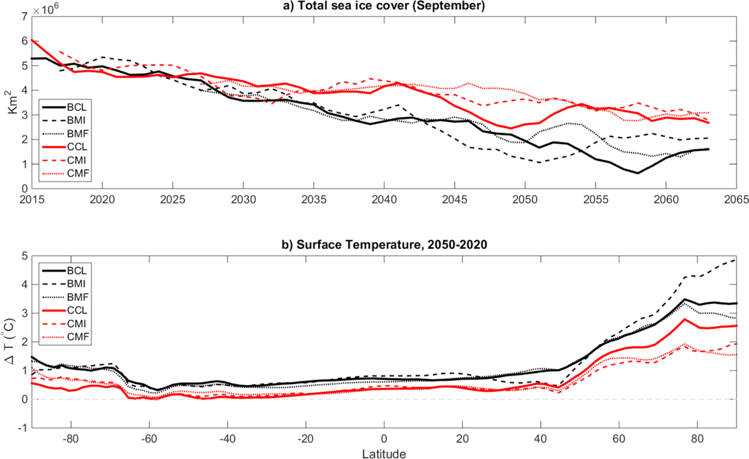 The Arctic sea-ice cover in September is reduced in all four experiments (figure 2(a)). Differences between experiments are the largest between 2045–2055 showing the greatest loss in BMI with 1.2 × 106 km2 less than in BCL, consistently with the previously estimated increase of Arctic warming and sea-ice loss due to aerosol emission reductions (Westervelt et al 2015, Acosta Navarro et al 2016, Acosta Navarro et al 2017). When the CO2 concentration is limited in experiment CCL, 1.2 × 106 km2 more sea-ice is preserved than in BCL, which is consistent with reduced global warming due to lower CO2 concentrations. On the other hand, contrary to previous studies (Westervelt et al 2015, Acosta Navarro et al 2016, Acosta Navarro et al 2017), reduced aerosol emissions combined with lower CO2 concentrations in CMI result in the preservation of an additional 1.3 × 106 km2 of sea-ice area.