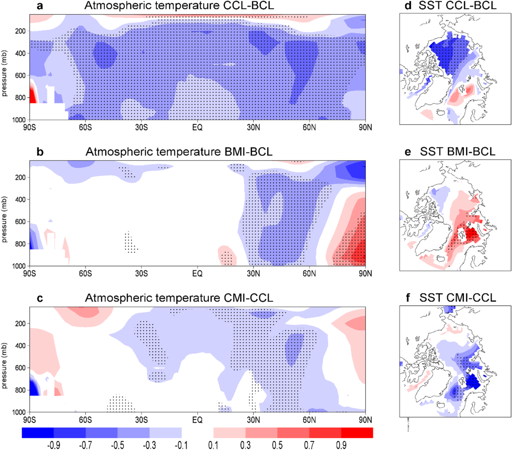 Figure 3. Differences between zonal means of atmospheric temperature (°C ) averaged between April and September and over 2036–2055: (a) CCL minus BCL, (b) BMI minus BCL, and (c) CMI minus CCL. Differences between SST (here SST represents temperature of the top layer of the ocean model) in the Arctic (°C) averaged between April and September and over 2036–2055: (d) CCL minus BCL, (e) BMI minus BCL, and (f) CMI minus CCL. Dots represent statistically significant areas.