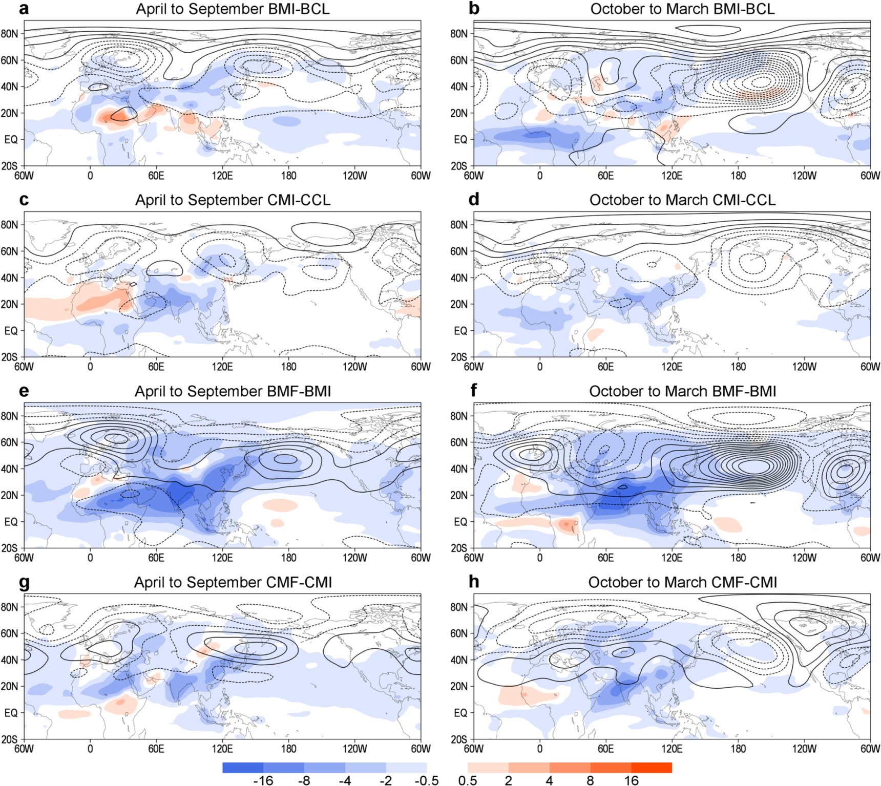 Standard image High-resolution imageFigure 4. April to September and October to March differences averaged over 2036–2055 between aerosol optical depths (AOD, coloured filled contours) and geopotential height at 500 mb (black isolines with 1 m contour interval and dashed isolines indicating negative values). (a), (b) BMI minus BCL. (c), (d) CMI minus CCL. (e), (f) BMF minus BMI. (g), (h) CMF minus CMI. Aerosol optical depths have 10−2 dimensionless units. Supplementary figure S4 shows statistical significance.