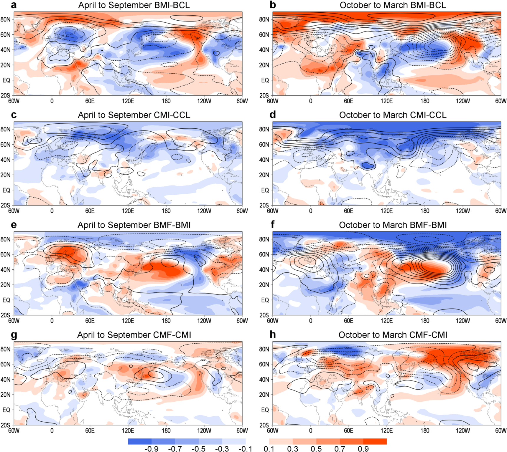 Standard image High-resolution imageReduced SO2 emissions in BMF compared to BMI determine a large reduction in AOD between the Atlantic and Pacific Oceans with the planetary wave limited to the middle and low latitudes and an anticyclone over the Pacific Ocean (figures 4(e), (f)). Very similar AOD reduction and anticyclone over the Pacific Ocean appear in CCL compared to BCL (supplementary figure S6), due to the reduced SO2 emissions from using less fossil fuel (Klimont et al 2017). The AOD reduction in CMF compared to CMI is smaller, because SO2 emissions are partly reduced already in CCL, and the planetary wave is insignificant (figures 4(g), (h)). Different atmospheric waves corresponding to BC and SO2 forcings indicate a strong impact of the regional distribution of the tropospheric forcing by atmospheric aerosols in agreement with Wang et al (2015).