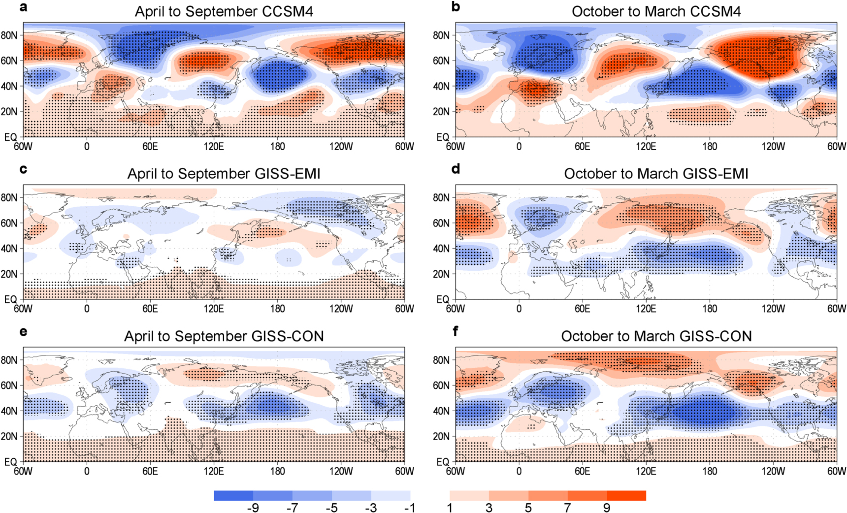 Figure 6. April–September and October–March differences of ensemble means of geopotential height at 500 mb (m) between 40 years averages centred in 1970 and 1930. Hemispheric averages are subtracted from geopotential heights. (a), (b) CCSM4. (c), (d) GISS-EMI. (e), (f) GISS-CON. Differences over dotted areas are statisticaly significant, covering most of high and low centres.