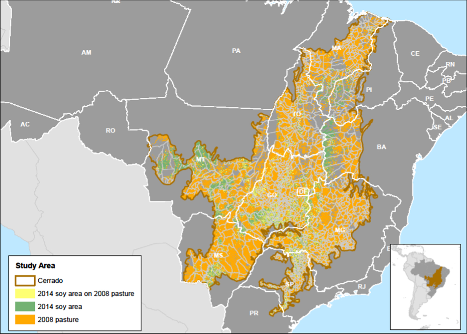Figure 1. 2014 soy area by Agrosatélite is depicted in green. All municipalities at least partially inside the brown Cerrado boundary are included in Soy Moratorium calculations. Integrated crop-livestock with soy analyses consider all municipalities with orange or yellow established pasture in 2008, calculated using data from TerraClass Cerrado and LAPIG.