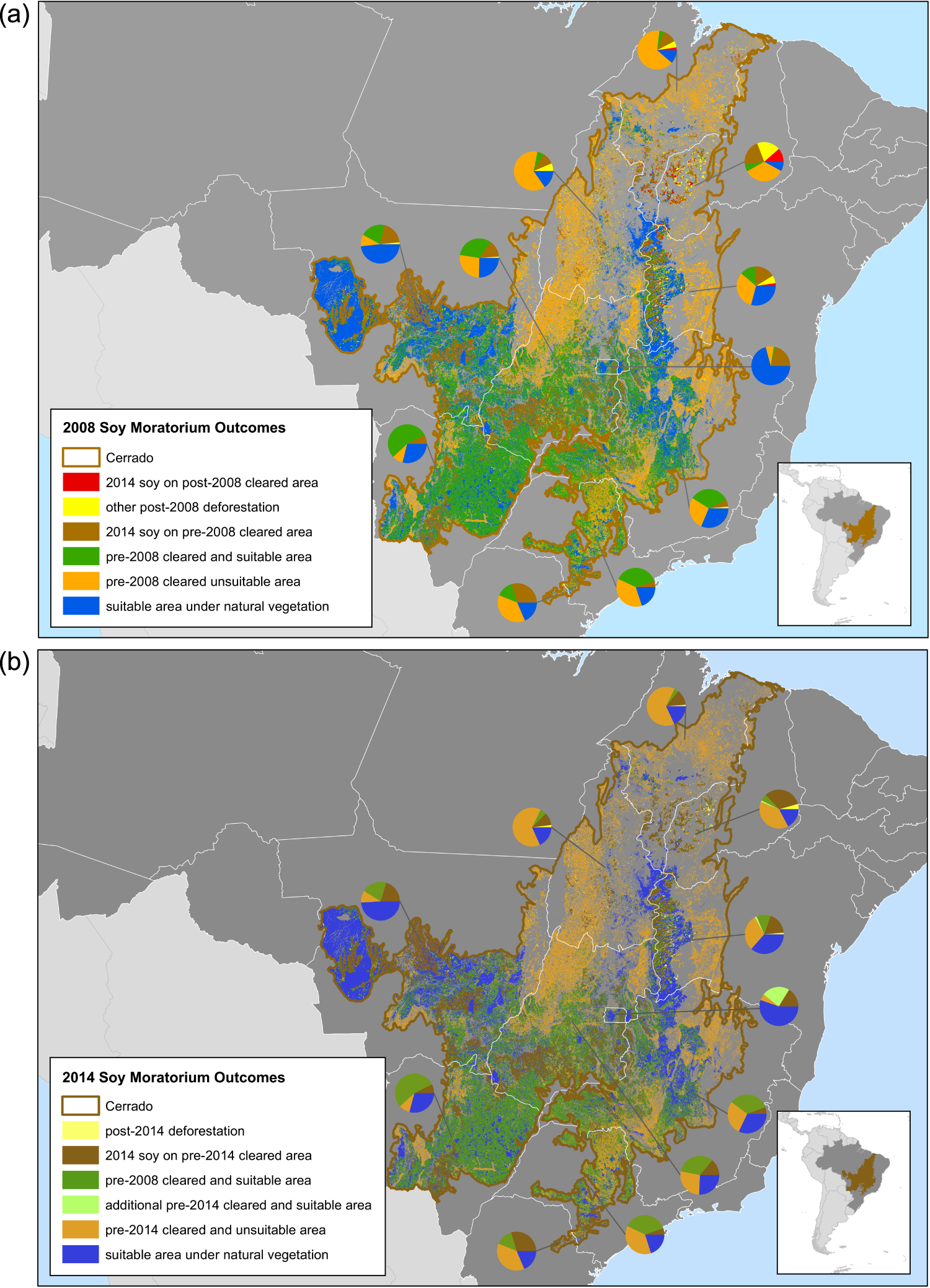 Figure 3. Relevant land use distributions and possible compliance outcomes for a (a) 2008 and (b) 2014 Cerrado Soy Moratorium.