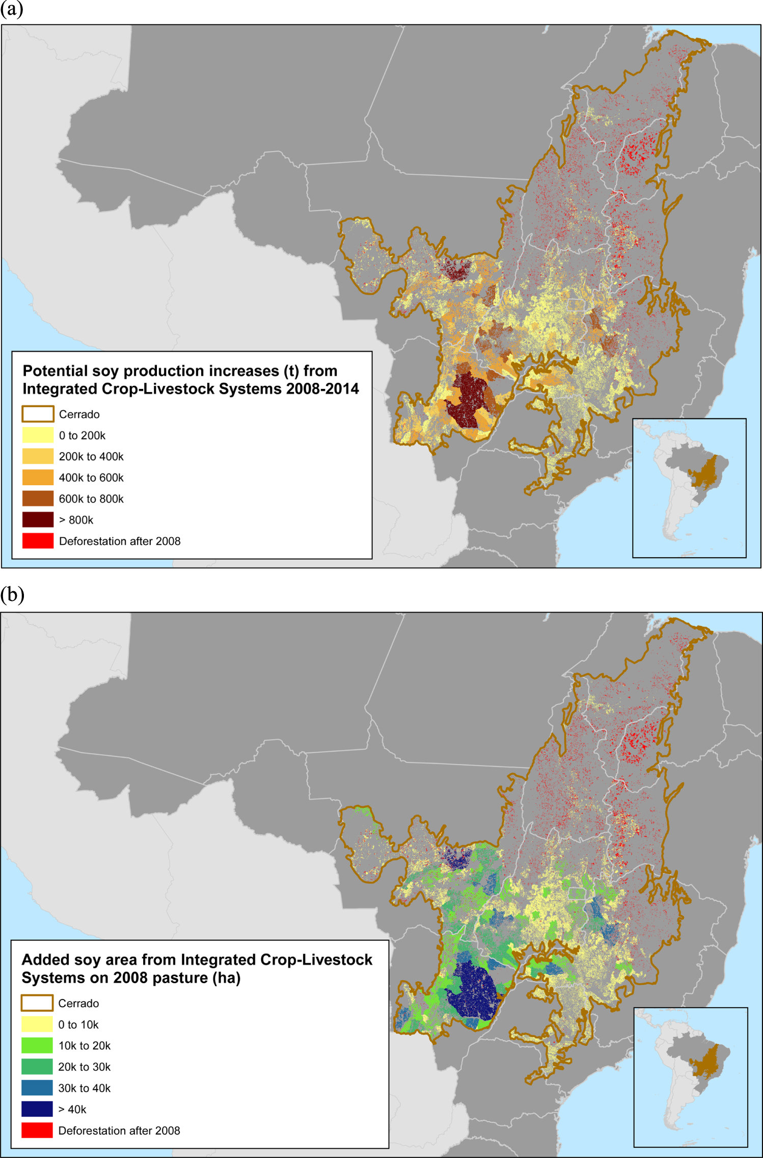 Figure 5. Integrated crop-livestock systems with Soy scenario where soybeans are planted onto 2008 pasture once every eight years (n = 8) between 2008 and 2014 depicting (a) additional quantity produced and (b) new soy area added. For n = 16, divide the legend numbers by 2, and for n = 4, multiply by 2.