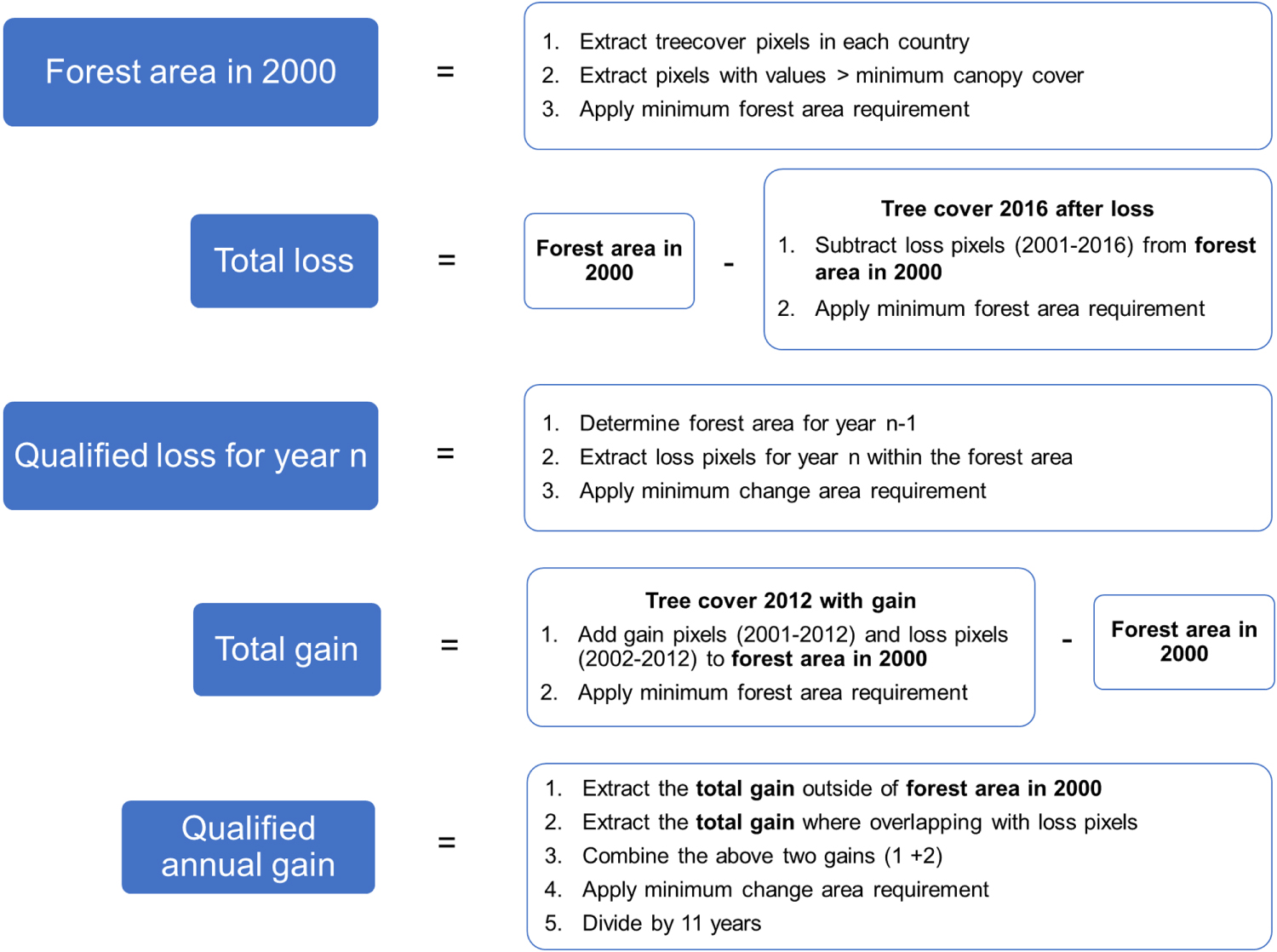 Figure 1. Calculation of biophysical forest areas using tree cover, loss and gain from the GFC dataset (see figure S1 for more information).