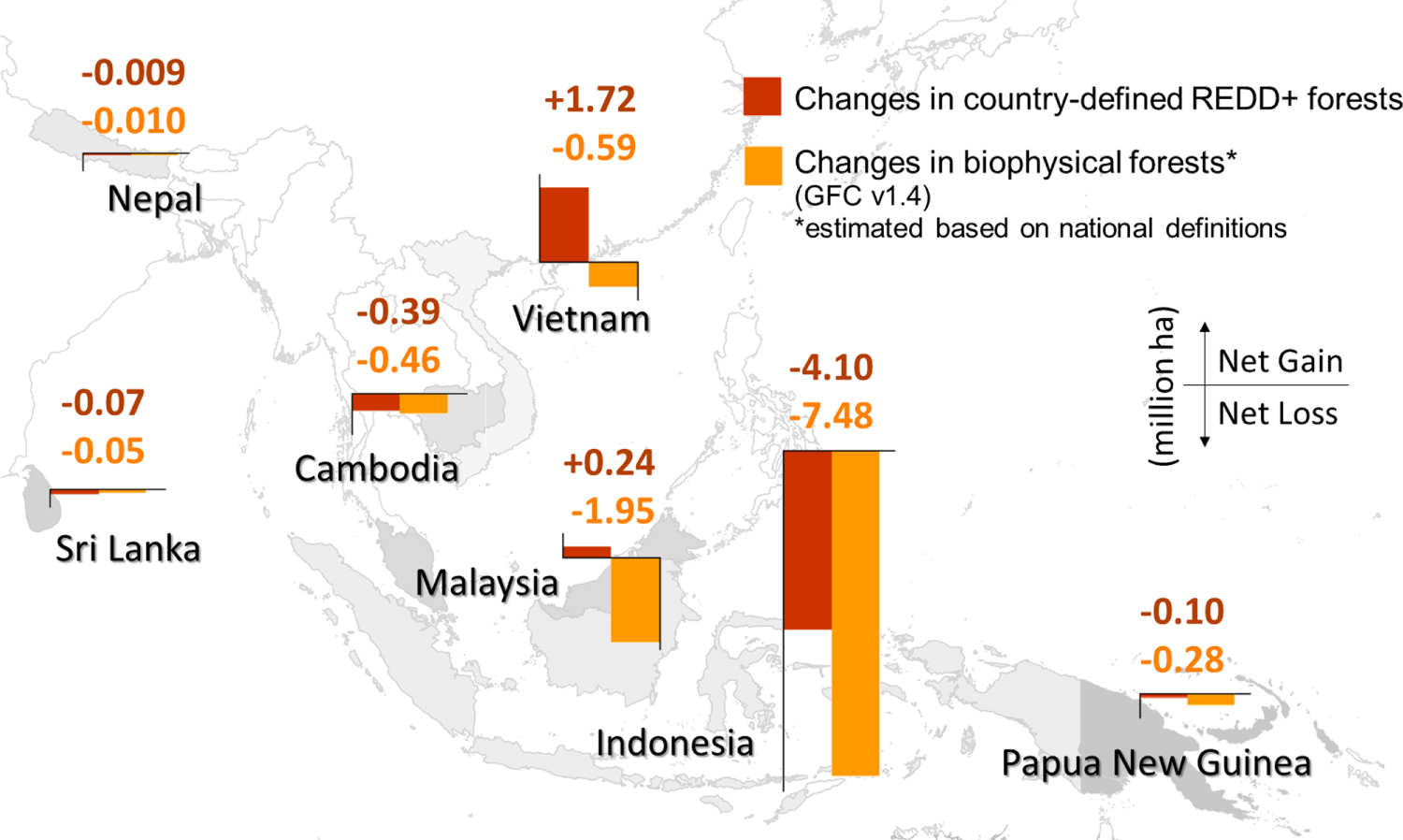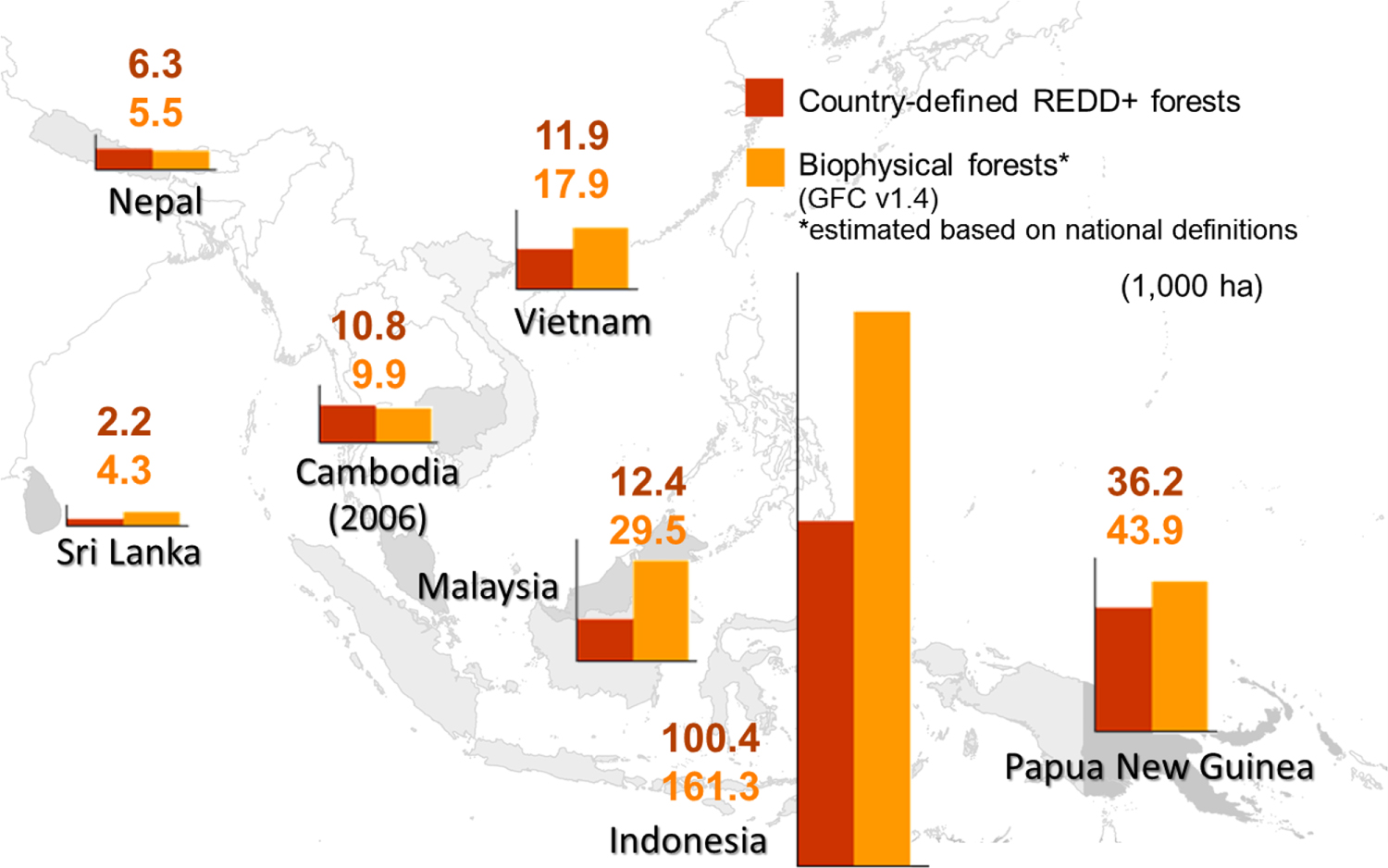 The annually updated GFC dataset (Hansen et al 2013) has given us independent and high resolution (30 m) data to map changes in biophysical forest areas, and we here have used this to assess the reference levels contained in the UNFCCC submissions of seven Asian countries. We have found significant differences in the size, and even direction, of changes in forest areas between the GFC dataset (processed to use national definitions), and the country-defined REDD+ forests.