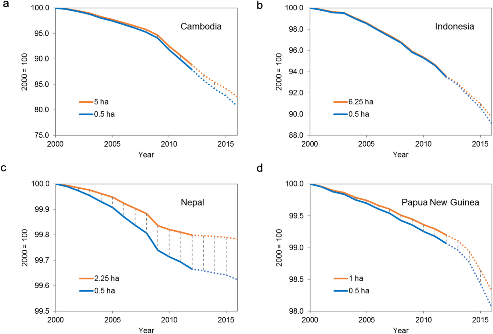Figure 5. Change in forest area under different minimum mapping units (see table S3 for numbers used in the comparisons) in four countries where the countries used large MMUs (>0.5 ha) to detect changes or to define forest areas. In all cases these are compared to 0.5 ha. After 2012, forest areas were calculated with forest loss only (shown dash lines), due to the limited availability of forest gain data (2000–2012).