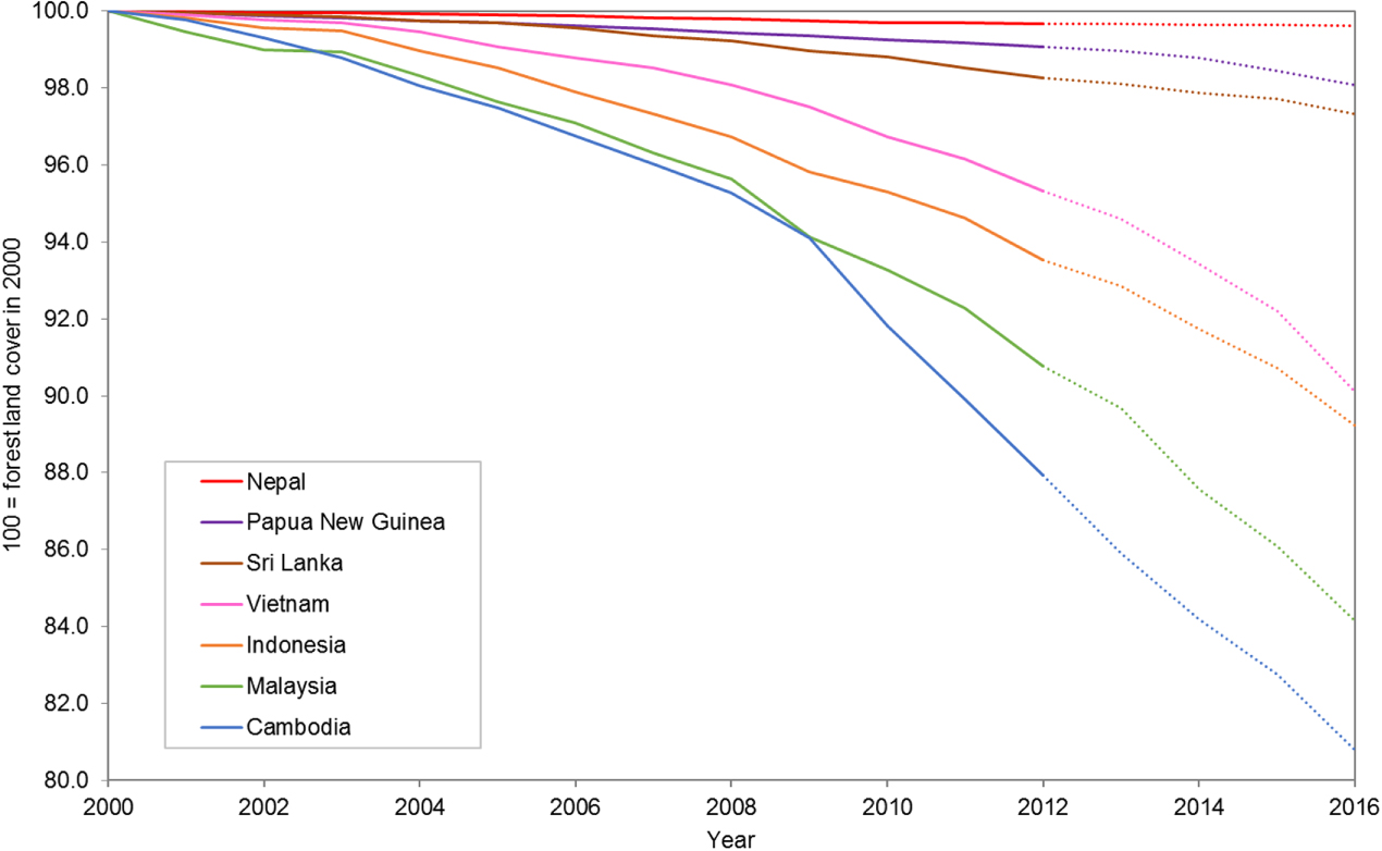 All seven countries show a declining trend of forest areas, with the largest decline in Malaysia until 2002, and then Cambodia thereafter. By 2012, forest areas were reduced by more than 12% in Cambodia and 9% in Malaysia, followed by Indonesia and Vietnam with 5%–6% loss, with some recent evidence of slowing deforestation in Indonesia, relative to the other three countries. While most of the forest areas were retained in Sri Lanka, Papua New Guinea, and Nepal between 2000–2012, Papua New Guinea showed an increasing deforestation trend, especially after 2014 (figure 6). The consistent net loss over the long term is an alarming evidence of emission trajectories in all the countries.