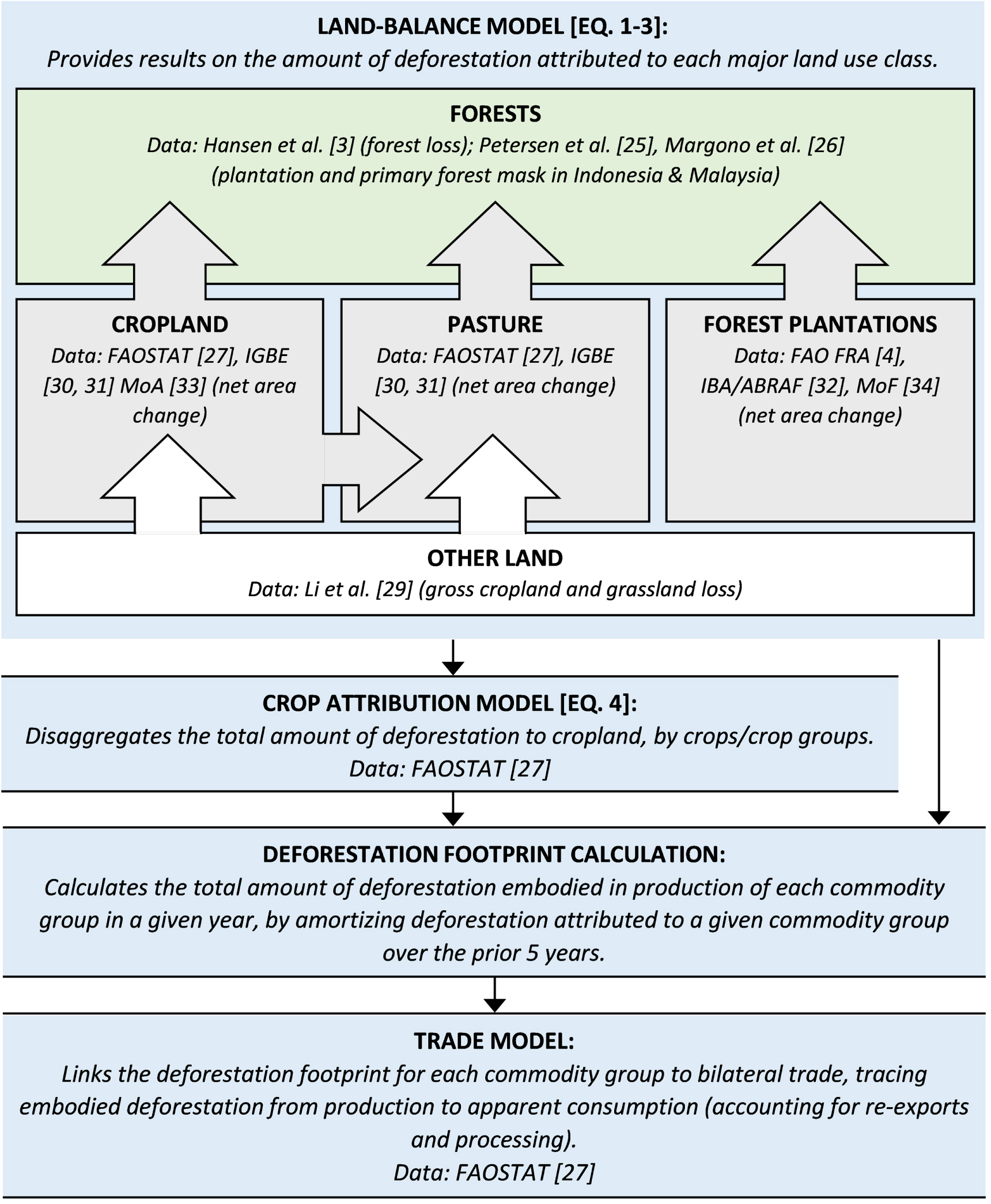 The method used for attributing deforestation to agricultural and forestry production, trade, and consumption, as well as the main data sources, are summarized in figure 1. Below we detail the main steps of the analysis—the land-balance model used for attributing deforestation first to major land-uses and then to commodities, and the bilateral trade model used for tracing embodied deforestation to consumer countries—as well as the classification scheme used to assess flows of embodied deforestation between countries at different stages of the forest transition.