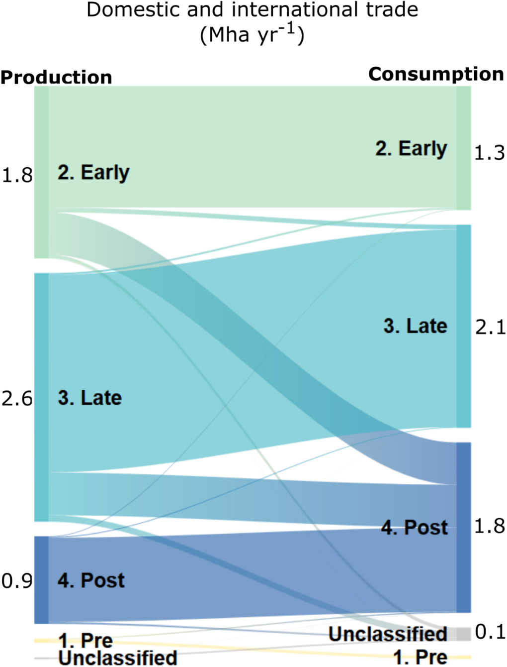 Figure 5. Trade flows of deforestation embodied in domestic consumption and international trade aggregated by forest transition stage. The left-hand side shows the area of deforestation embodied in production, while the right hand side shows the deforestation embodied in consumption. While most deforestation was embodied in production of agricultural and forestry commodities in early- and late-transition countries, most (79%) of deforestation embodied in export was consumed in post-transition countries. Unclassified countries consumed 9% of deforestation attributed to export.