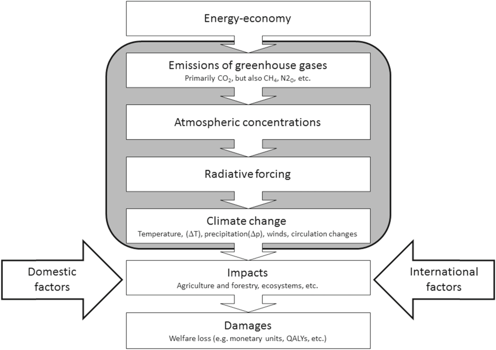 Figure 1. Cause-effect chain from socioeconomic causes of emissions through to climate change and damages. Altered from Fuglestvedt et al (2003). The grey box encompasses that segment of the causal chain that is considered in the joint emissions-emergence index. International and domestic factors that are not directly caused by climate change are shown in the arrows.