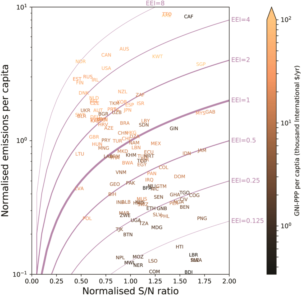 Figure 3. Normalised, population-weighted S/N ratios (bottom axis) and normalised per capita GWP* emissions for 130 countries with populations >1 M. Lines of constant EEI are plotted as solid curves. Country acronyms and abbreviations are coloured by purchasing power parity gross national product (GNP-PPP) sourced from The World Bank. Countries experiencing stronger emergence are located towards the right of the plot. Countries contributing more, per capita, to climate change are located towards the top of the plot.
