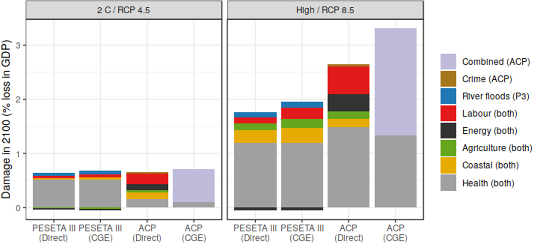Damages, as a percent of EU (for PESETA III) or US (for ACP) GDP, under a low/moderate emissions scenario (left) or a high scenario (right). The ACP values represent the median across damage uncertainty for each sector, evaluated in welfare terms. For the ACP, a sectoral breakdown of the CGE results is not available; these are shown combined. To provide a consistent comparison to PESETA III, the ACP CGE results are supplemented by an additional health impact that represents the difference between the ACP market value of the mortality impact (which is incorporated in the CGE) and the ACP mortality impact valued using the VSL.