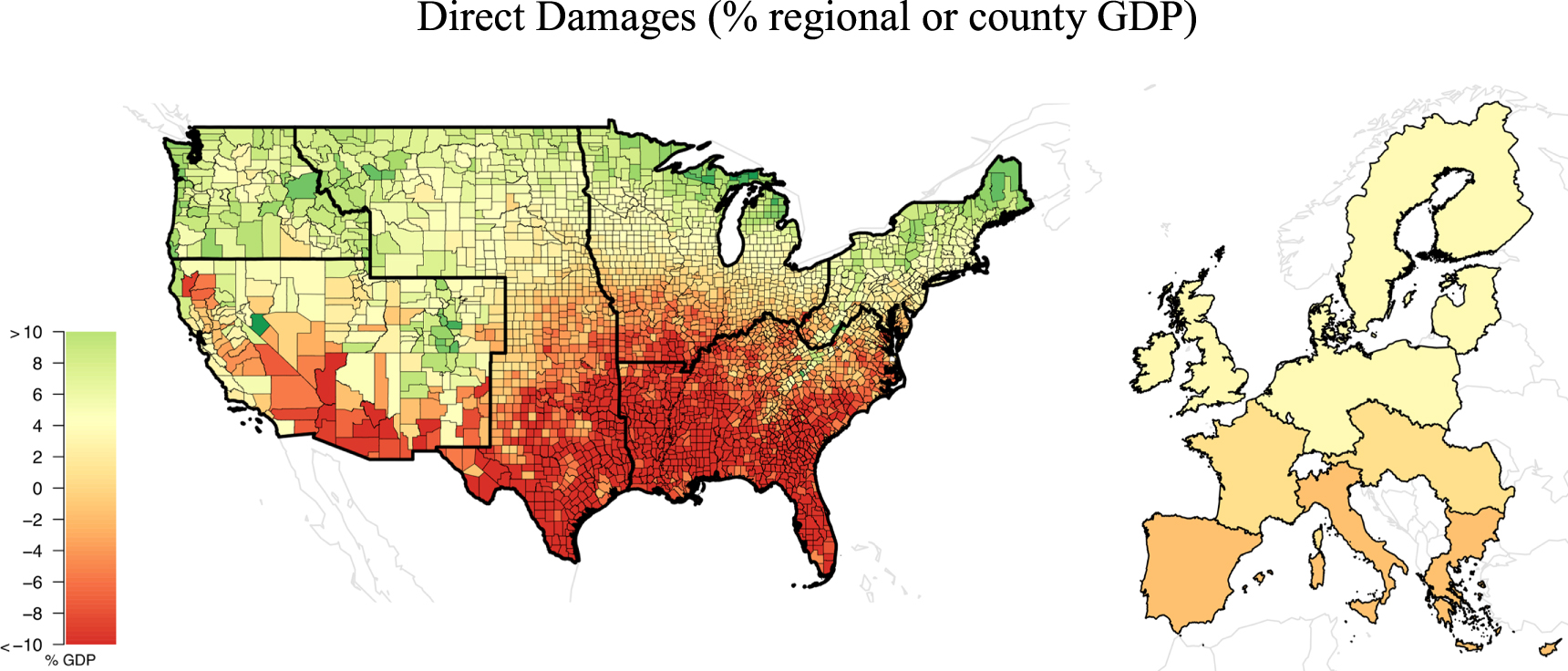 Standard image High-resolution imageThe direct damages, prior to CGE modelling. At this level of analysis, the ACP results (Hsiang et al 2017) can be displayed at a county level, showing a strong north–south divide. The PESETA III direct damages are calculated at the same scale as the CGE, also show a gradient but with less sharp extremes.