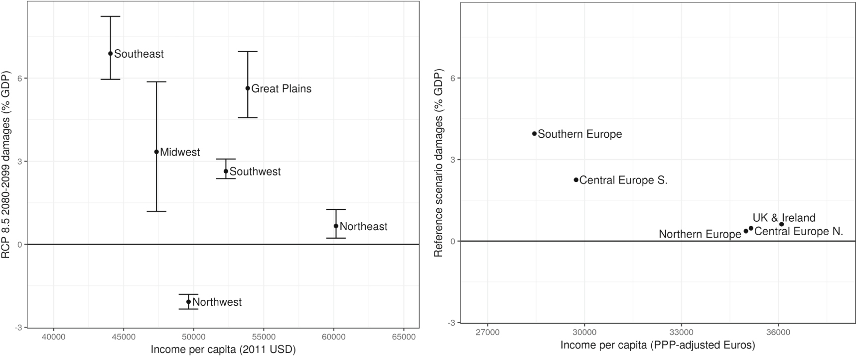 Thirdly, there are large geographic asymmetries at the continental scale in both the EU and US (figure 2), and in both cases these asymmetries serve to amplify pre-existing economic inequality. In the EU there is a clear gradient of growing losses towards the southern regions (a north–south divide). Figure 3 left shows the negative association between damage and regional income in the US, the error bounds are the 17th–83rd quantile and the dot is at the median, and figure 3 right shows the results for the EU (median of the considered climate realizations).