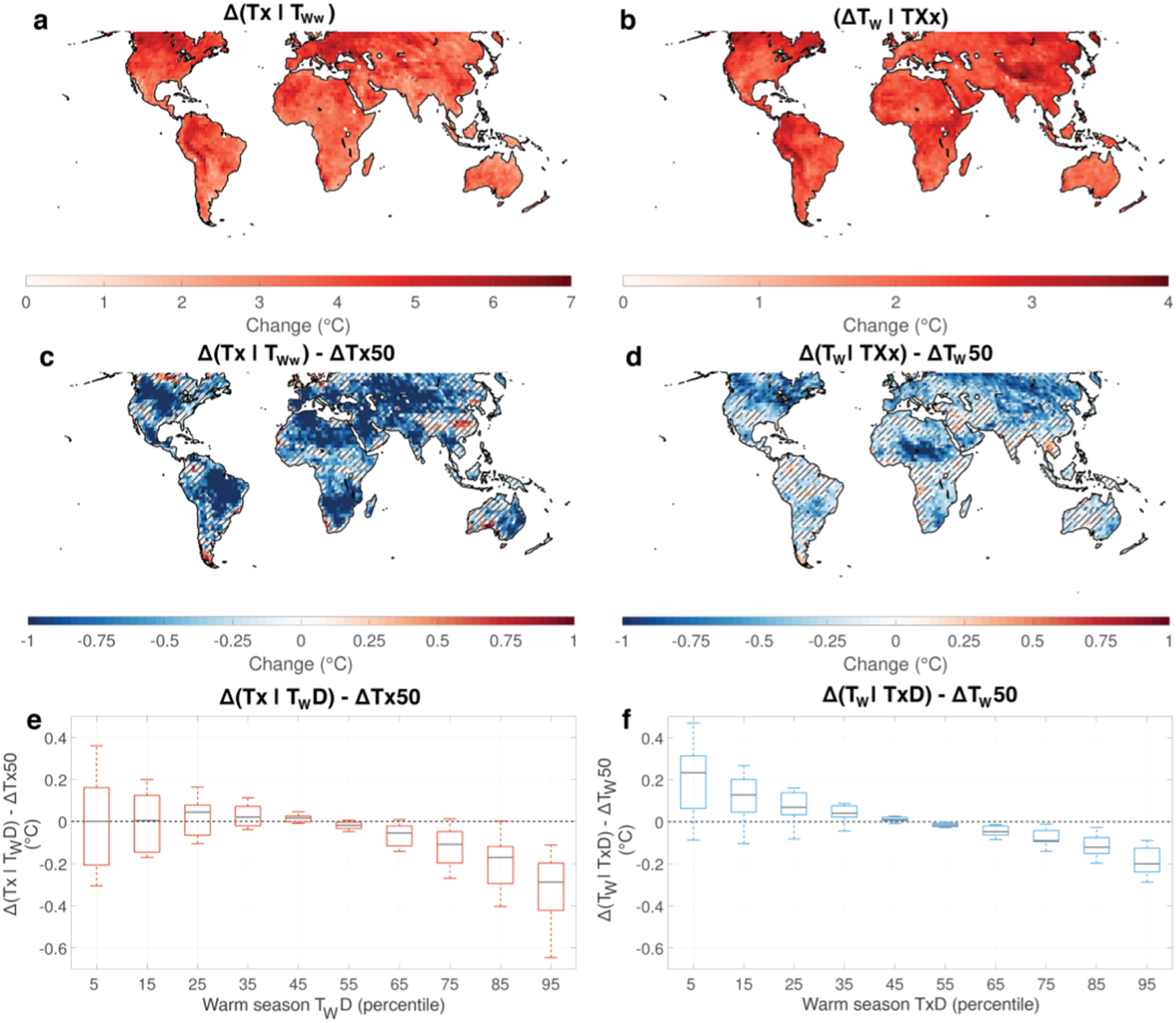 Figure 2. Interactions between Tx and TW change. (a) Multi-model median projected change in Tx on the TWw day (Δ(Tx ∣ TWw)). (b) Multi-model median projected change in TW on the TXx day (Δ(TW ∣ TXx)). (c) Tx amplification on the TWw day, defined as the multi-model median projected change in Tx on the TWw day minus the projected change in warm season 50th percentile Tx (Δ(Tx ∣ TWw) − ΔTx50). (d) TW amplification on the TXx day, defined as the multi-model median projected change in TW on the TXx day minus the projected change in warm season 50th percentile TW (Δ(TW ∣ TXx ) − ΔTW50). Hatching in (c) and (d) indicates less than 2/3 model agreement on the sign of the amplification. (e) Multi-model median global mean Tx amplification across the TW distribution (Δ(Tx ∣ TWD) − ΔTx50). (f) Multi-model median global mean TW amplification across the Tx distribution. Boxplots show the 10th–90th percentile range across the model ensemble.