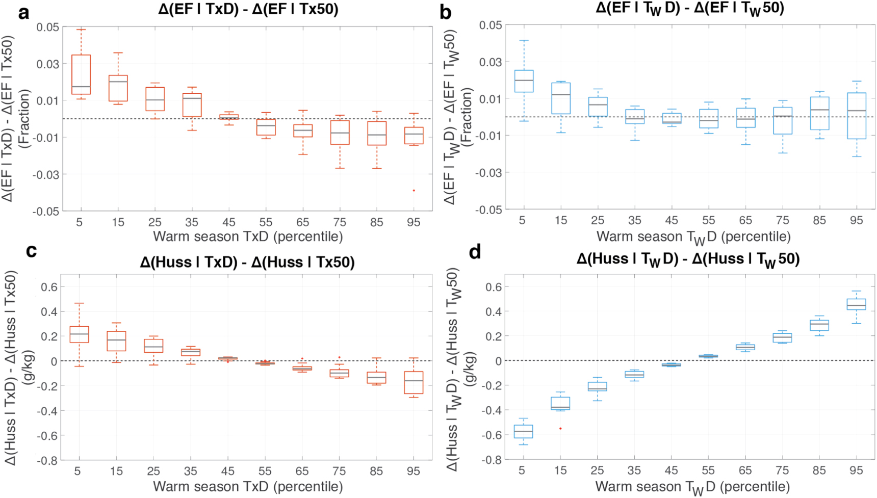 Figure 3. Evaporative fraction and specific humidity changes across the Tx and TW distributions. (a) EF amplification, defined as the change in EF on days in each Tx decile, relative to the change at the 50th percentile (denoted as Δ(EF ∣ TxD) − Δ(EF ∣ Tx50)). (b) EF amplification, defined as the change in EF on days in each TW decile, relative to the change at the 50th percentile (denoted as Δ(EF ∣ TWD) − Δ(EF ∣ TW50)). (c) Specific humidity amplification, defined as the change in specific humidity on days in each Tx decile, relative to the change at the 50th percentile (denoted as Δ(Huss ∣ TxD) − Δ(Huss ∣ Tx50)). (d) Specific humidity amplification, defined as the change in specific humidity on days in each TW decile, relative to the change at the 50th percentile (denoted as Δ(Huss ∣ TWD) − Δ(huss ∣ TW50)). Boxplots show the 10th–90th percentile range across models.