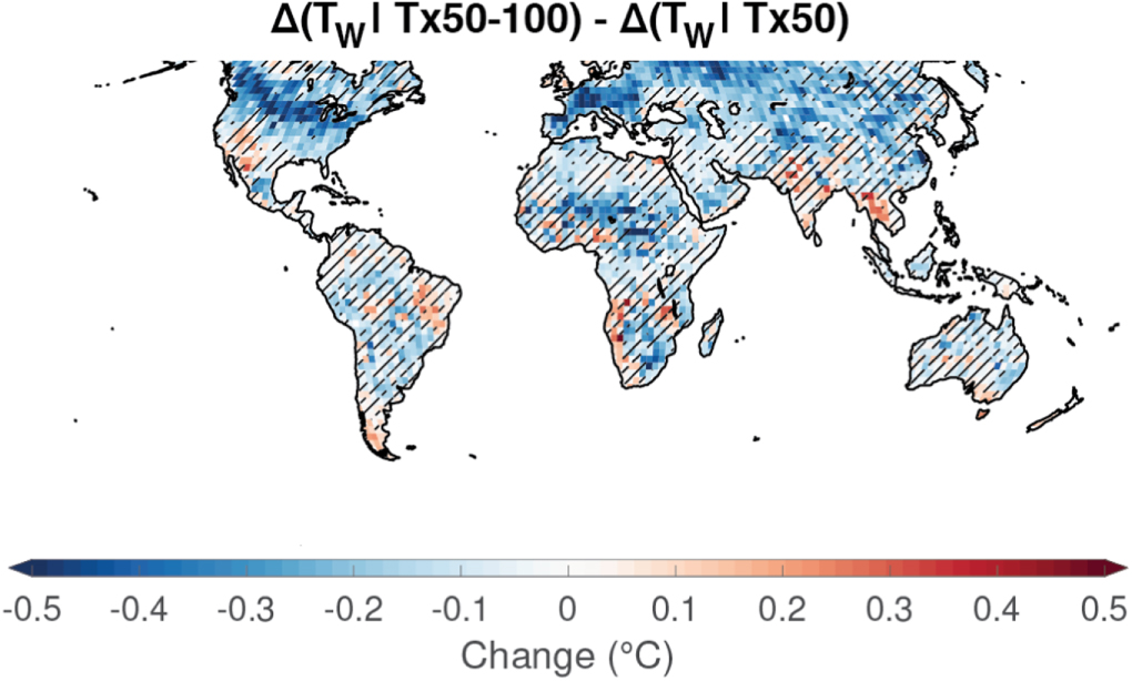 Figure 4. The effect of amplified Tx and specific humidity change on TW amplification. Multi-model median estimated warm season TW amplification from Tx amplification (Δ(TW ∣ Tx50–100) − Δ(TW ∣ Tx50)). This amplification is defined as the change in TW across the top half of the Tx distribution (Tx50–100) minus the TW change that occurs at the 50th percentile of the Tx distribution (see Methods). Hatching indicates less than 2/3 model agreement on the sign of the change.