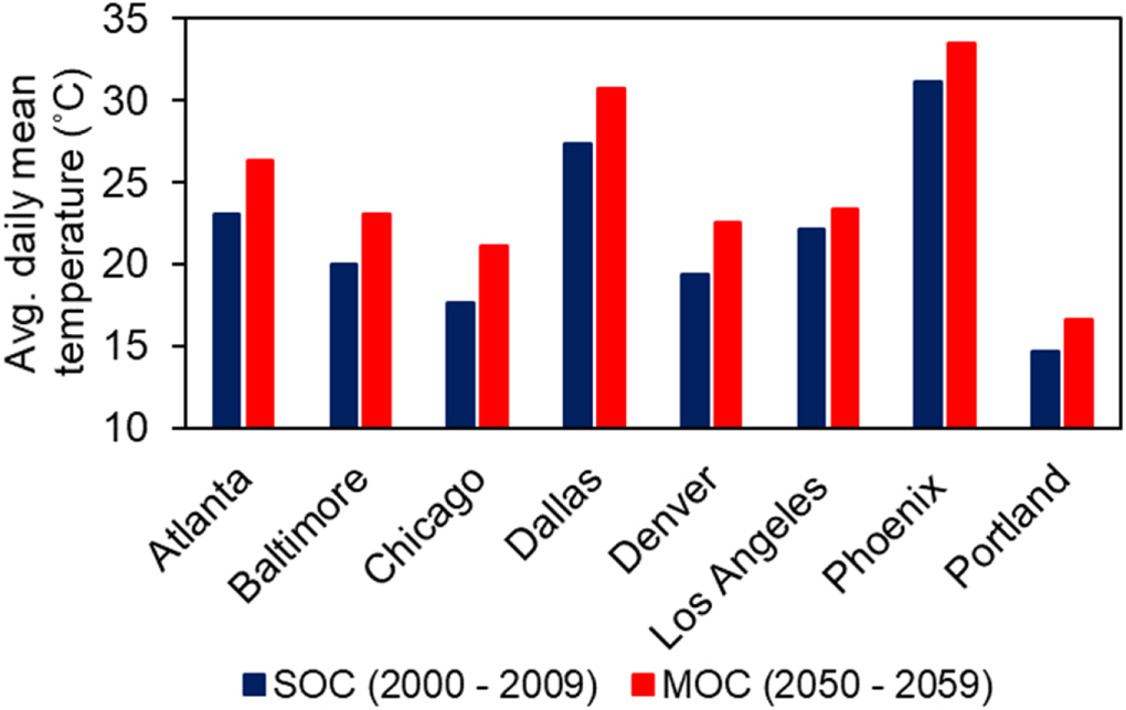 Figure 2 shows the change in average daily mean temperature (June–Aug) from SOC to MOC for all cities (output from WRF). As the data suggest, average daily mean temperature can potentially increase by 2 °C–4 °C in the modeled cities. We used these projections to run EnergyPlus simulations and obtained the corresponding indoor temperature data.