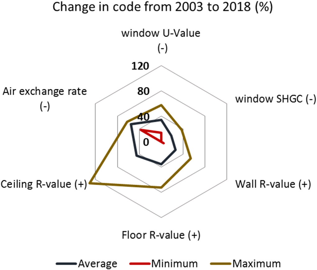 Figure 5. The normalized difference (%) in envelope properties between the two code versions in all climates. The + and − signs indicate increase or decrease in the value of each property, respectively. Window solar heat gain coefficient (SHGC) is the fraction of incoming solar energy that is transferred to the indoor space through windows in the form of heat.