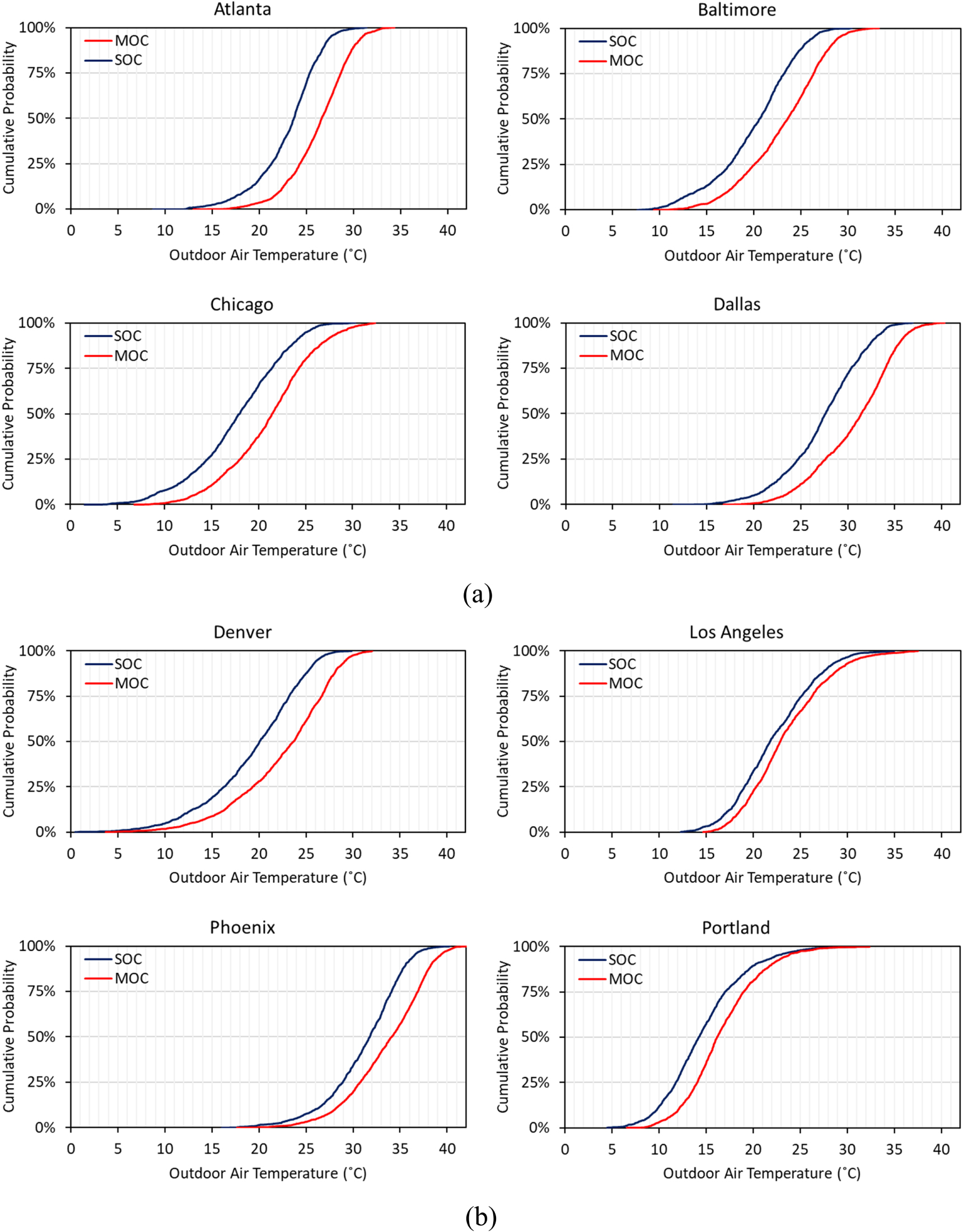 Figure B1. Decadal cumulative probability of summertime (June–Aug) outdoor air temperature for SOC and MOC in the (a) Atlanta, Baltimore, Chicago, and Dallas (b) Denver, Los Angeles, Phoenix, and Portland.