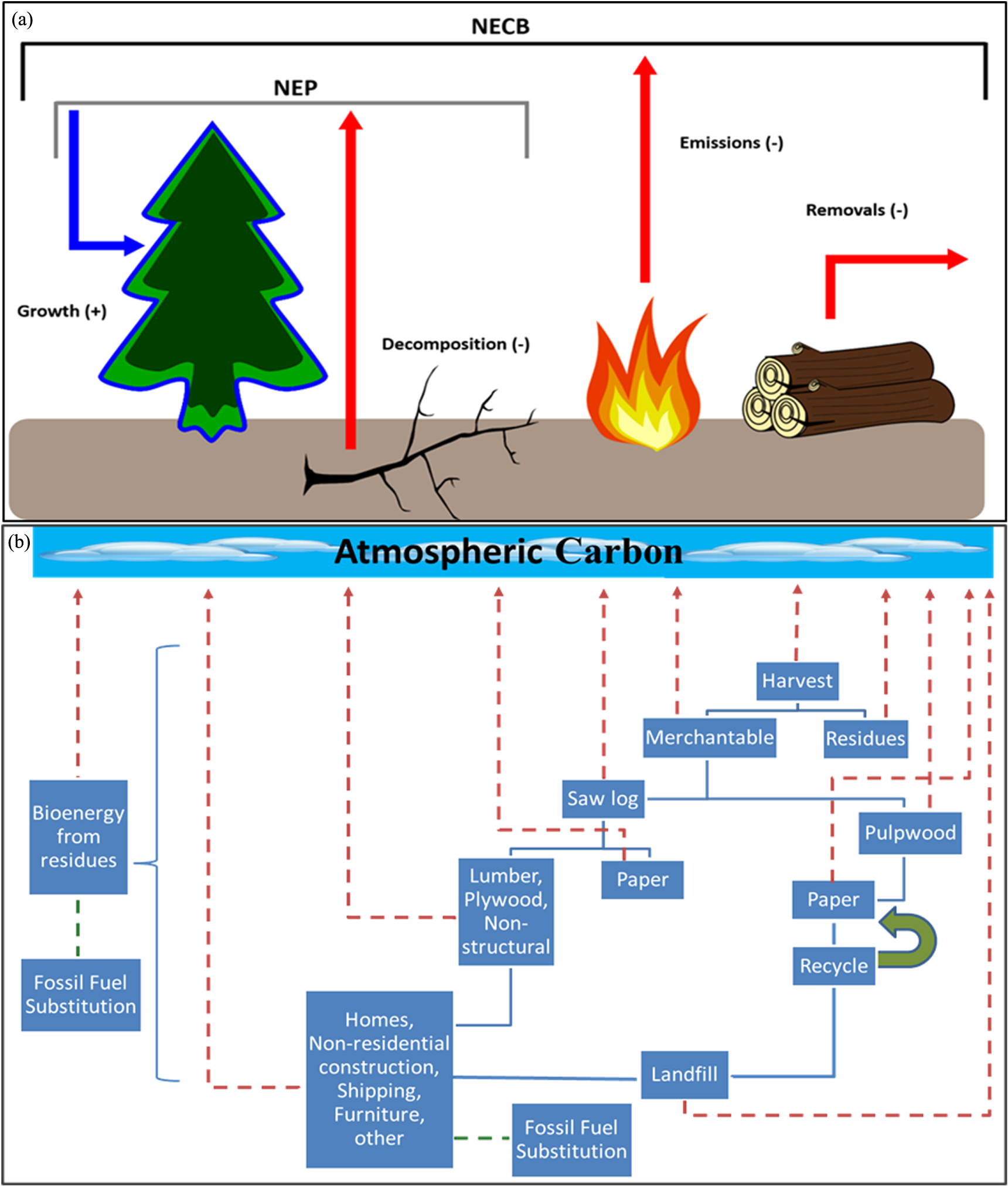 Figure 1. Conceptual diagram of Forest-GHG (a) describes the natural, land-based forest carbon sink where the net of growth and decomposition is net ecosystem production (NEP), and after accounting for removals from fire and harvest, the balance is net ecosystem carbon balance (NECB), (b) describes the cascade of wood products until eventual deposition in landfills or the atmosphere and shows the pathway of emissions.