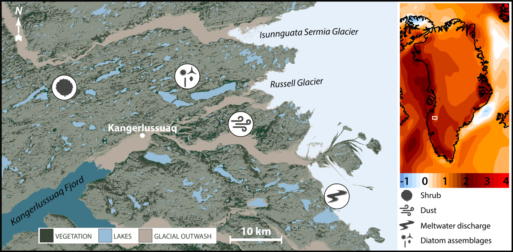 Figure 1. The paraglacial landscape around Kangerlussuaq, West Greenland. Legends indicate key landscape features (bottom left) and focal environmental responses (lower far right). Inset depicts recent warming in Greenland as indicated by temperature anomaly (°C, indicated in color scale), annual 1995–2015 minus 1979–1994, based on European Reanalysis Interim (ERA-Interim) with map created using Climate Reanalyzer; location of Kangerlussuaq region indicated by white box.