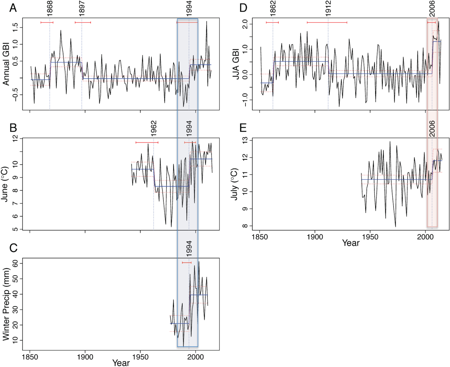 Figure 2. Nonlinear changes in the Greenland Blocking Index (GBI) and climate of the Kangerlussuaq region over time. Horizontal red bars depict significant breakpoints with 95% confidence intervals; when significant breakpoints were found, blue bars across data depict the average before and after breakpoints and red dashed lines show 95% confidence intervals around the fitted mean values of the response for periods between each break point.: (A) annual GBI with breakpoints (BPs) at 1868, 1897 and 1994; (B) mean June air temperatures from local weather stations, with BPs at 1962 and 1994; (C) winter precipitation (DJF) from local weather station, with BP at 1994; (D) summer (JJA) GBI with BPs at 1862, 1912, and 2006; and (E) mean July air temperatures from local weather stations, with BP at 2006. The period denoted as Winter/Spring BP indicated with blue box; period of Summer BP indicated by red box.