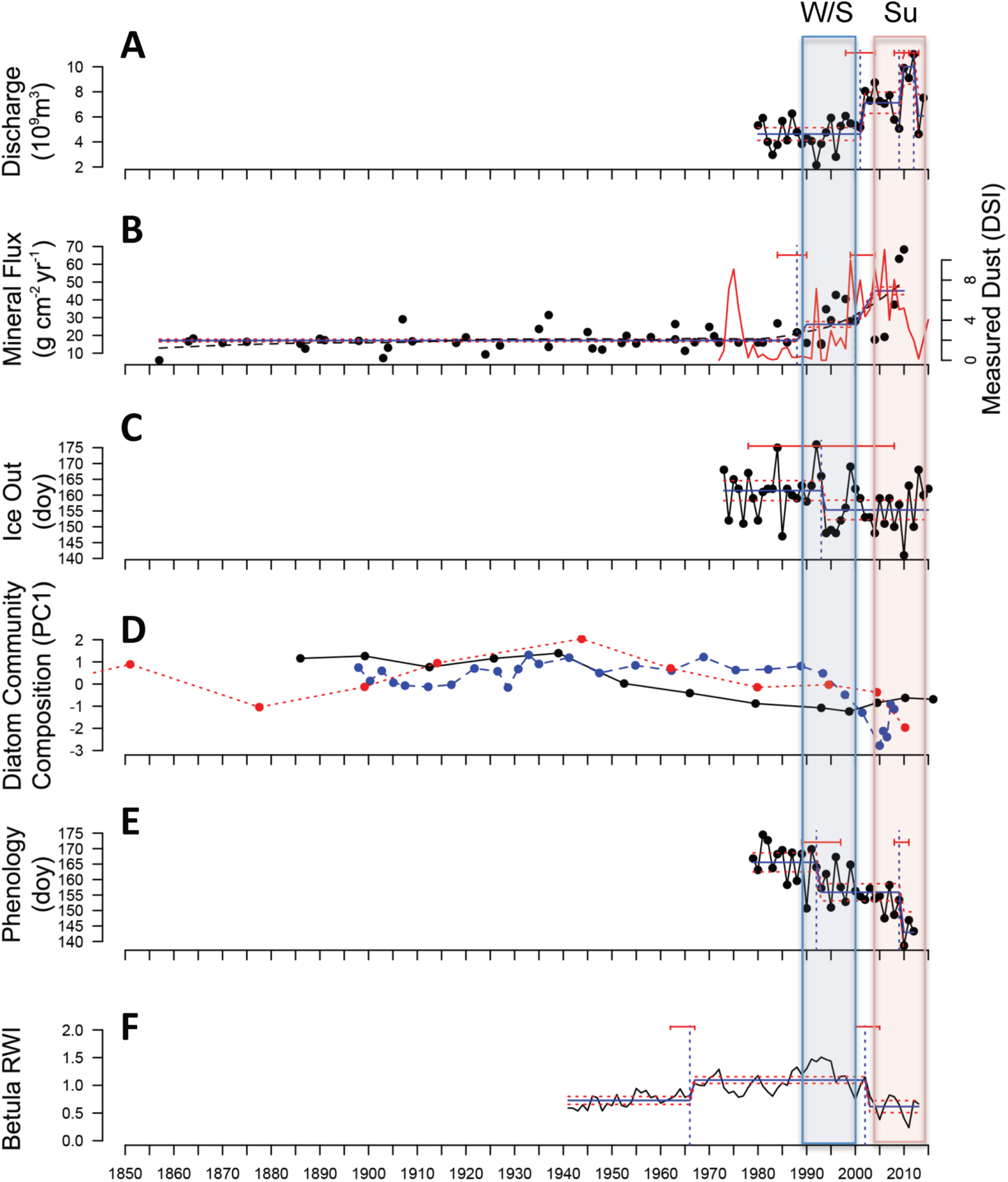 Figure 3. Environmental response across the Kangerlussuaq landscape over at least the past four decades. (A) Water discharge from the Greenland Ice Sheet; (B) dust (as mineral flux to lake sediments (black line) and as the instrumental Dust Storm Index (DSI; red line)) (C) day of year (DOY) of lake ice out; (D) diatom community turnover (as indicated by Principal Components (PC) Axis 1 scores, explaining 12%–21% of variance) in lake sediment records from SS901 (red), SS903 (blue), SS15 (black); (E) plant phenology (DOY of 50% species emergence across the entire local plant community); (F) shrub (Betula nana) stem Ring Width Index (RWI). Breakpoints are as defined in figure 2: period of Winter/Spring (W/S) Breakpoint indicated with blue box; period of Summer (Su) Breakpoint indicated by red box. Horizontal red bars above each response depict significant breakpoints with 95% confidence intervals; when significant breakpoints were found, blue bars across data depict the average for that period. Red dashed lines show 95% confidence intervals around the fitted mean values of the response for periods between each break point. Analysis of the dust record is only on the mineral flux record.