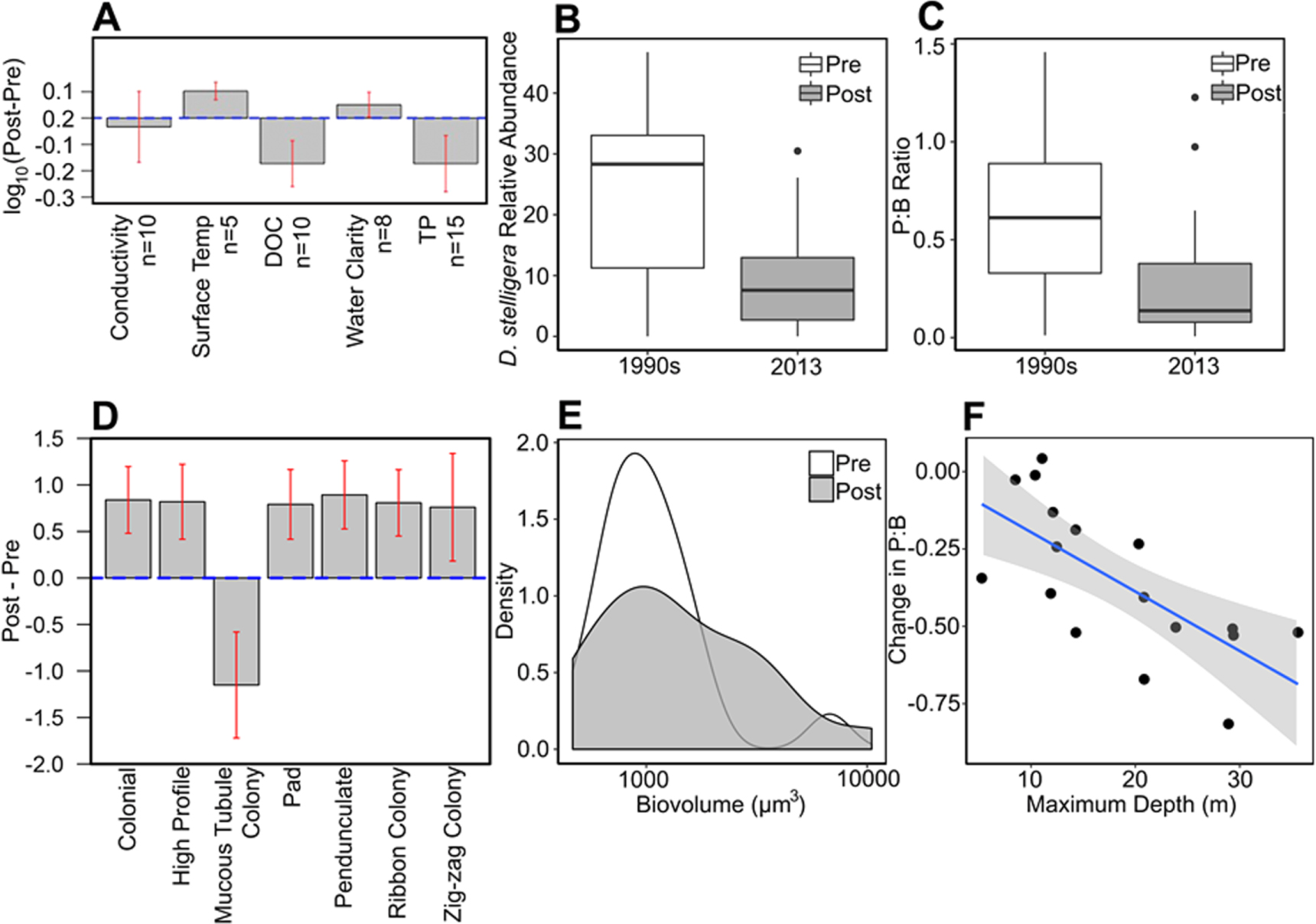 Figure 4. Lake response to the climate breakpoints. (A) Comparison of water column characteristics pre- and post-Summer BP, including dissolved organic carbon (DOC) and total phosphorus (TP), with number of lakes for each parameter indicated by n, red bars indicate 95% confidence intervals for the two-sided t-tests. Data for (B)–(F) are comparisons of fossil diatom assemblages in surface sediments of 18 lakes sampled in 1990s (integrate ∼1980–1998) and re-sampled in 2013 (integrate ∼1993–2013): (B) percent relative abundance of the indicator taxon Discostella stelligera, black bars represent the interquartile range of the data; (C) pelagic:benthic (P:B) of assemblages, with lower P:B suggesting greater proportion of benthic diatom taxa, black bars as in (B); (D) change in functional traits of diatom communities expressed as Post-Pre, red bars as in (A); (E) density plot of the distribution of diatom cell size (biovolume); and (F) change in P:B with lake depth, shaded area is 95% confidence region.
