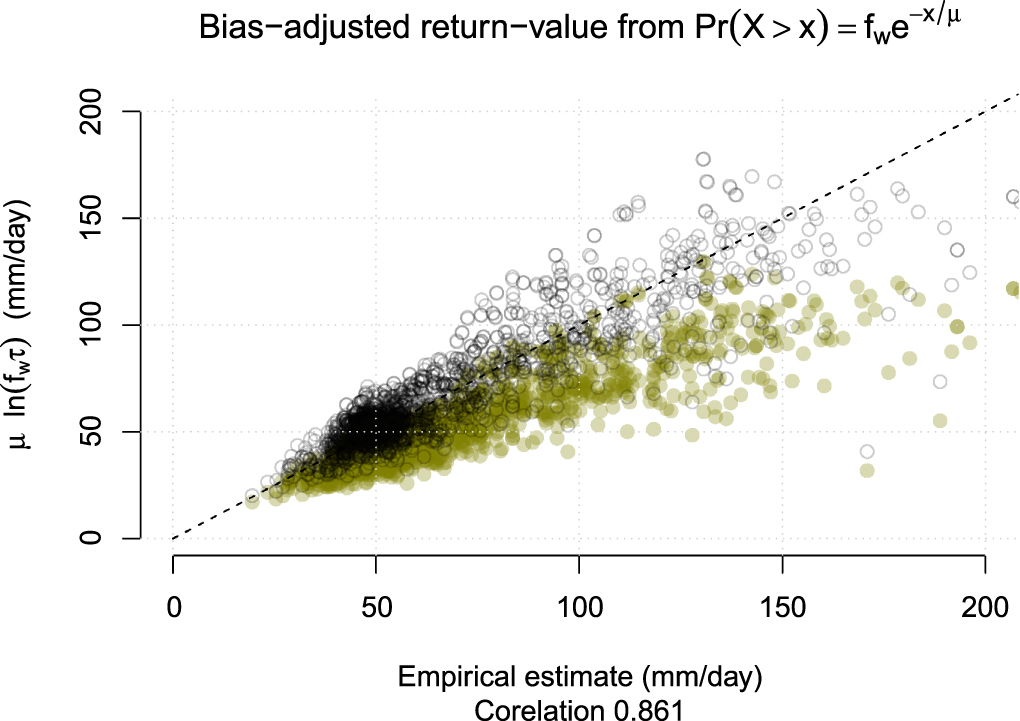 (equation (B.9)) with the empirical estimates, the threshold above which there was one observed event per decade on average. The empirical estimates were crude with wide error bars, but with a high volume of data, it was possible to discern a pattern. Figure 5 shows a scatter plot comparing the empirical estimates of the 10-year return-value for 1875 stations and the return-value estimate based on equation (1); a correlation of 0.86 suggests that it is possible to get an approximate estimate of the 10-year return value for daily precipitation based on fw and μ. One question is the minimum length of the series required to get good estimates for fw and μ, and if the rain gauge series is stationary, then we would expect fw and μ to converge to their true values. However, the rainfall data is not stationary, as cumulative estimates for fw suggests (SM), and xτ is expected to change overtime with trends in fw and μ. The results also showed a low bias that increased with higher rainfall amounts. We used a regression analysis to estimate a scaling factor for bias-adjustment: