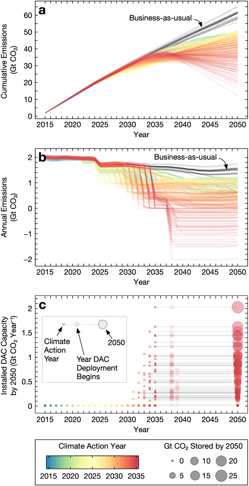 Figure 1. (a) Cumulative CO2 emissions; (b) annual CO2 emissions; and (c) DAC deployment under different climate action years. Each individual curve or data point represents a single uncertainty scenario. Segments in (c) indicate the delay between start of climate action and actual deployment of DAC plants.