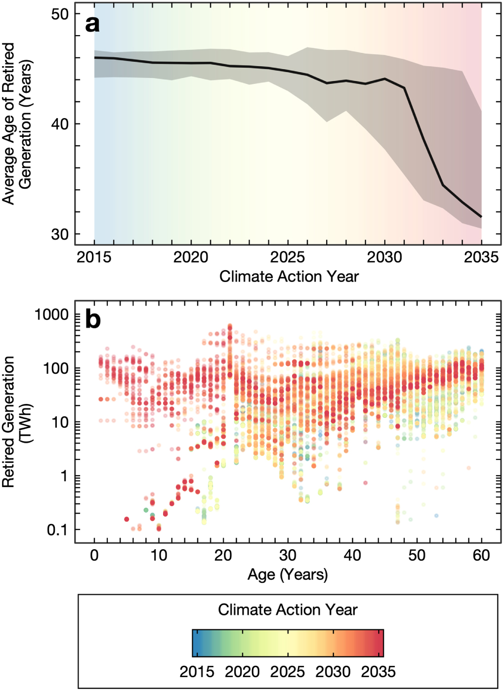 Figure 3. (a) Generation-weighted average age of retired EGUs as a function of climate action year, where solid line represents the median, and bands represent first and ninth decile values across uncertainty scenarios; and (b) retired generation as a function of EGU age for all uncertainty scenarios.