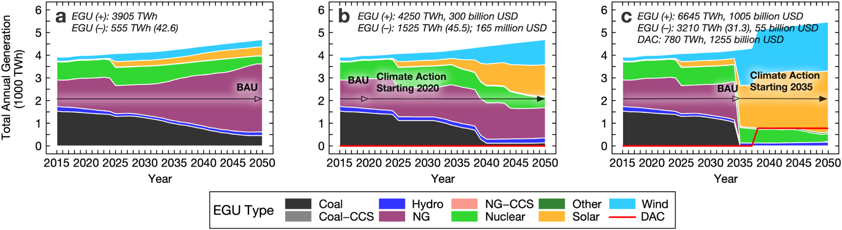 Figure 4. Least-cost technology trajectories under (a) BAU; (b) climate action starting in 2020; and (c) climate action starting in 2035. Values shown for a single uncertainty scenario. EGU additions are retirements through 2050 are marked by EGU (+) and EGU (–), respectively. Costs in (b) and (c) are relative to BAU, and cost of EGU additions relative to BAU include any savings in fuel and operating costs. Values in parentheses next to EGU (–) indicate the average age of retired generation.