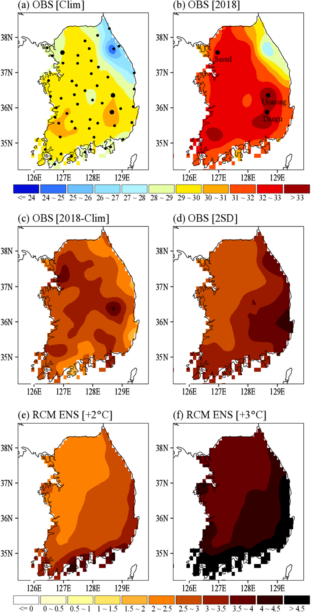 Figure 1. Spatial distribution of Tmax (°C) averaged over July–August from 30-year (1976–2005, (a)) and one-year (2018, (b)) observational data and their difference (2018 minus 30-year climatology, (c)). Spatial distribution of the two standard deviation range derived from July to August observed Tmax during 1976–2005 (d). Future changes in Tmax simulated from four downscaled projections under 2 °C and 3 °C global warming (e), (f). The values at 56 in situ observation stations are interpolated into grids using an inverse distance weighting interpolation method.