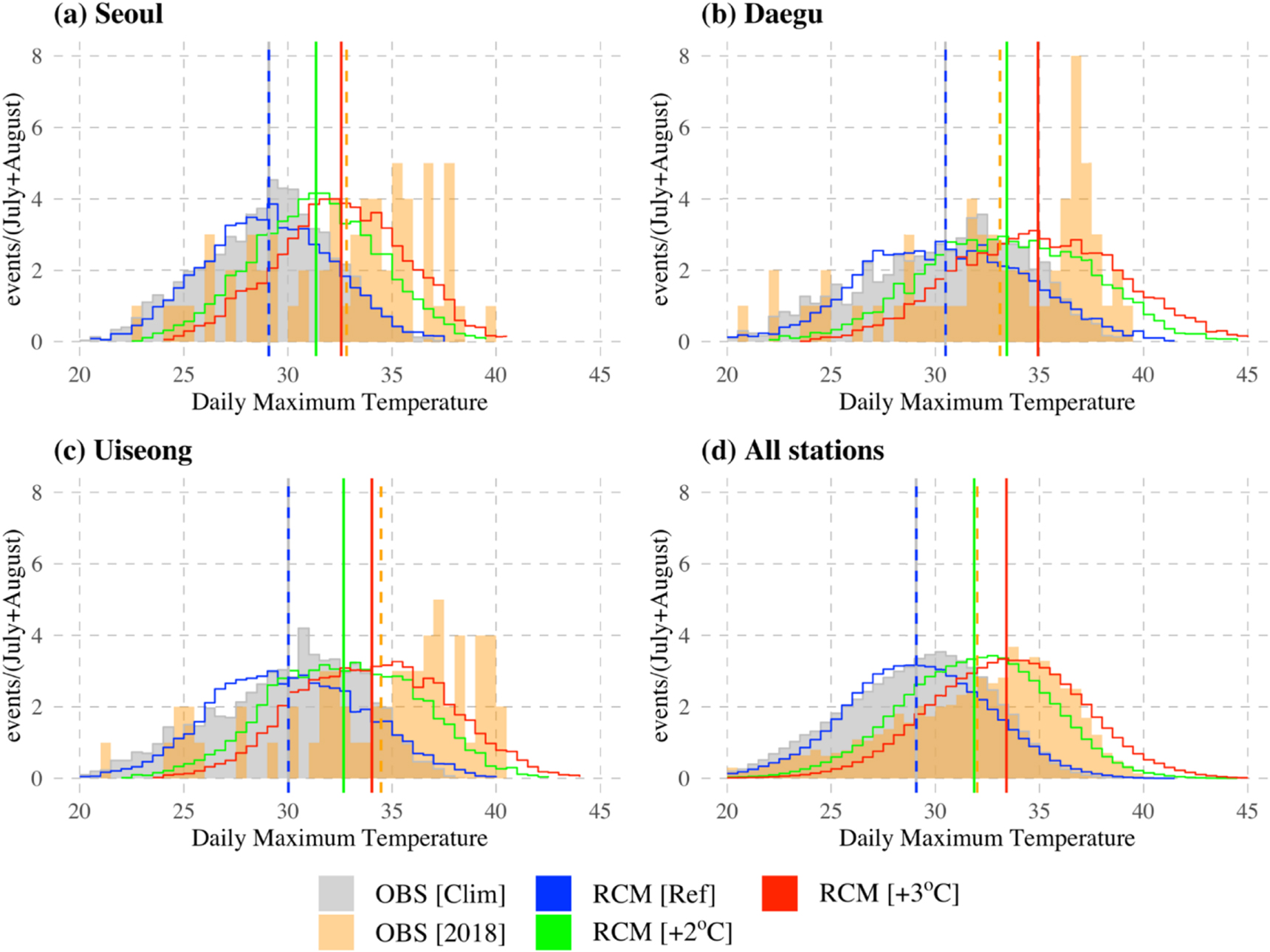 Figure 2. Frequency distribution of daily Tmax (°C) during July and August at Seoul (a), Daegu (b), Uiseong (c), and all 56 stations (d). All Tmax values occurring in the target period are pooled and then divided by the number of years with respect to each bin. The results from four projections are pooled together without averaging. The vertical lines indicate the average value corresponding to the distribution with the same color (solid lines for RCM, but dashed lines for OBS). The curves denoted by 'OBS [Clim]' and 'RCM [Ref]' in this figure are the same as 'OBS[Clim]' and 'All RCMs' in figure S1, respectively.