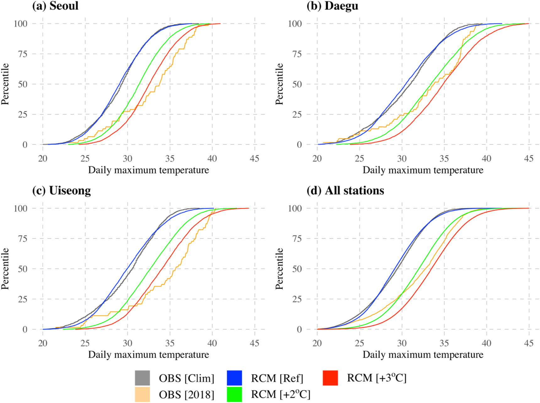 In summer 2018, South Korea experienced unprecedented extreme hot temperatures over its entire territory. The Korean Meteorological Administration (KMA) reported that record-breaking daily Tmax and consecutive hot days were repeatedly observed in 2018 (KMA 2019). For example, Tmax in Seoul rose to 39.6 °C, which is the highest value ever recorded in the 111 year observational history at that location. Furthermore, Tmax exceeding 40 °C was recorded at Hongchen (41 °C) and Uiseong (40.4 °C), which are unprecedentedly hot temperatures in Korea. The station-averaged number of heatwaves (defined as Tmax more than 33 °C over 2 d based on the criterion for heatwave advisory issued by the KMA) in Korea in 2018 was 31.4 d (9.8 d of average per year), which is the highest since observations commenced. Not only the maximum temperature, but also the minimum temperature set a new record, with an exceptionally long period of tropical nights (i.e. 17.7 d) compared to the climatological average (i.e. 5.1 d). Although in-depth analysis and further study are required for robust attribution of the observed record-breaking extreme temperatures in 2018, it is probably inexplicable in the absence of any anthropogenic influence. Indeed, Min et al (2014) and Kim et al (2018) demonstrated the anthropogenic influences on the summer 2013 Korean heatwave using the fraction of attributable risk approach, in which the probability of extreme events occurring is compared in two hypothetical worlds, one without and one with human influences.