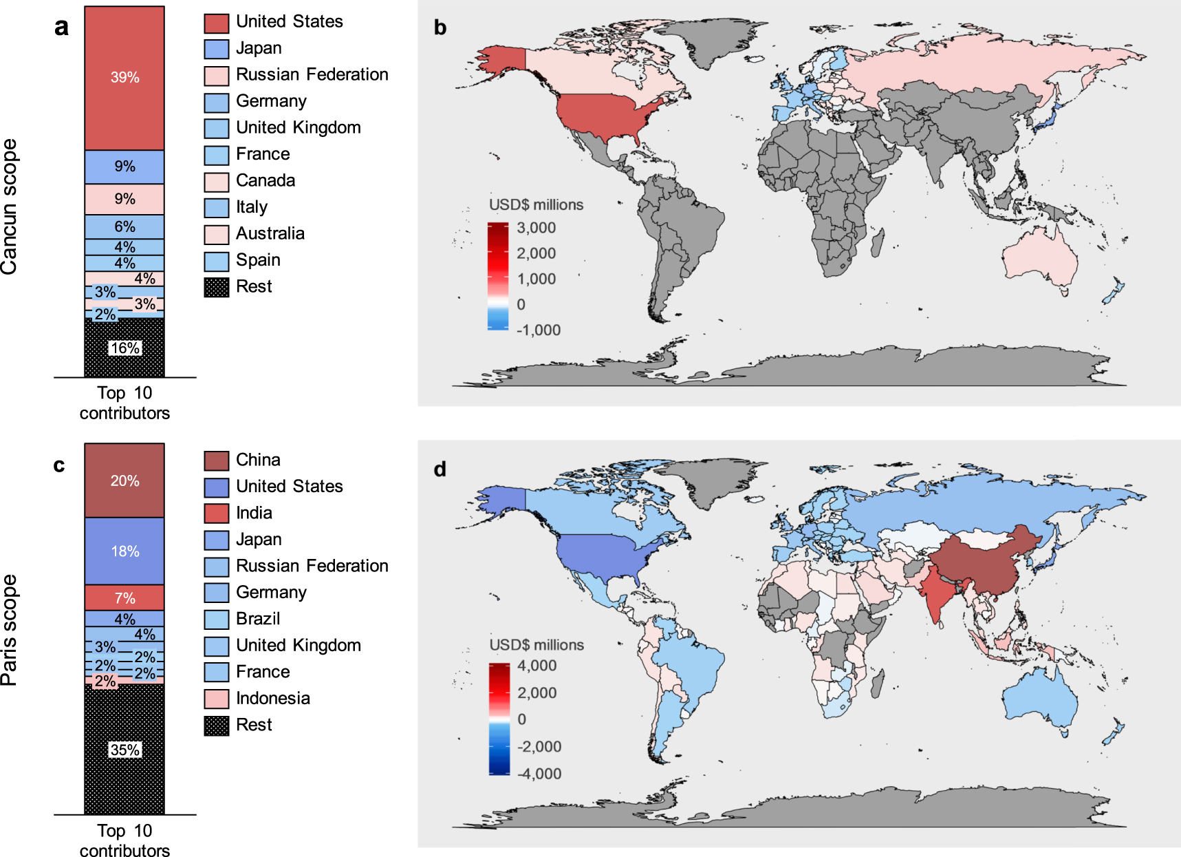 Finally, the proposed mechanism can be extended to include the international aviation and shipping industries (see Methods). We find that the climate finance responsibilities of international aviation and international shipping amounts to USD$2.2 billion and USD$1.1 billion, respectively, placing both among the top 20 contributors (Paris scope, baseline calculations).