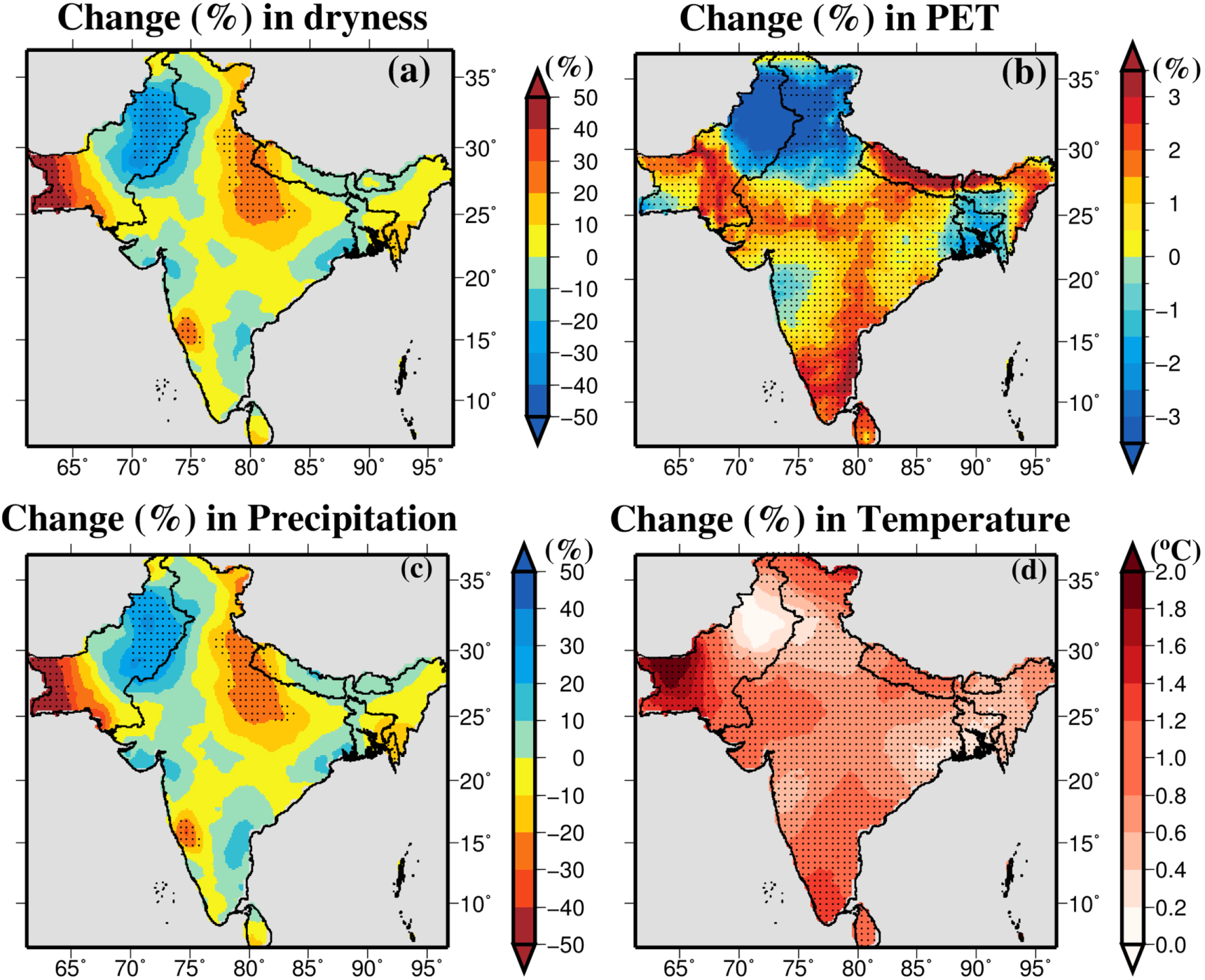 Figure 1. Observed changes (%) in dryness index, potential evapotranspiration (PET), Precipitation, and Temperature during 1951–2016. (a) Changes (%) in dryness index, (b) changes (%) in annual PET, (c) changes (%) in annual precipitation, and (d) changes (%) in annual mean temperature during the observational record of 1951–2016 based on the Climate Research Unit (CRU) data. Changes [trend slope X duration] in (a)–(d) were estimated using non-parametric Mann–Kendall test and Sen's slope method. Stippling in (a)–(d) shows statistically significant changes at 5% significance level.