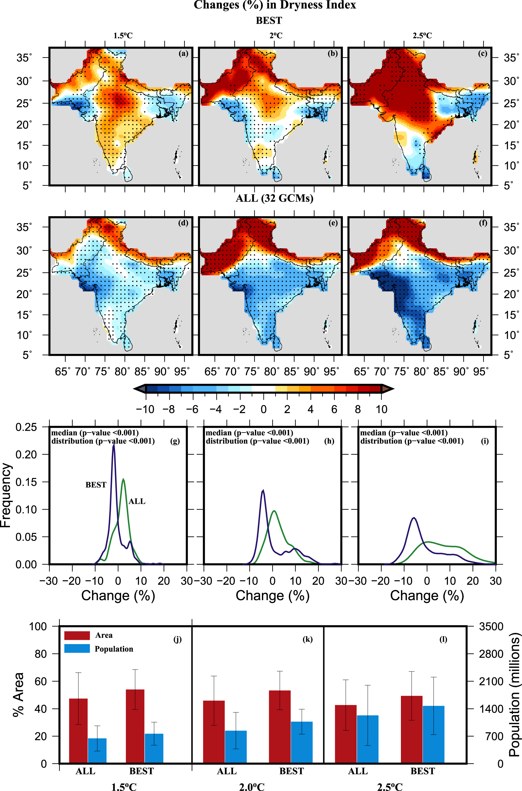 Figure 3. Projected changes in dryness index and affected population in South Asia under 1.5 °C, 2.0 °C, and 2.5 °C warming worlds. (a)–(c) Ensemble mean projected changes (%) from BEST-GCMs in dryness index in South Asia for 1.5 °C, 2.0 °C, and 2.5 °C rise in global mean temperature from the pre-industrial level. Changes (%) in (a)–(c) were estimated against the current climate of 1971–2000. (d)–(f) Same as (a)–(c) but for ALL-GCMs, respectively. (g)–(i) Empirical probability distribution of changes (%) in dryness index for BEST GCMs (in green) and ALL-GCMs (in blue) in South Asia under 1.5 °C, 2.0 °C, and 2.5 °C warming. (j) Area (%, in red) and population (millions, in cyan) affected by increased dryness index in South Asia under 1.5 °C warming world from ALL-GCMs and BEST-GCMs, and ((k) and (l)) same as (j) but for 2.0 °C and 2.5 °C warming worlds. Error bars in (j)–(l) show inter-model variation (estimated using one standard deviation) in area and population using the ALL and BEST-GCMs. Stippling in (a)–(f) shows more than 50% GCMs agree on the same sign of change.